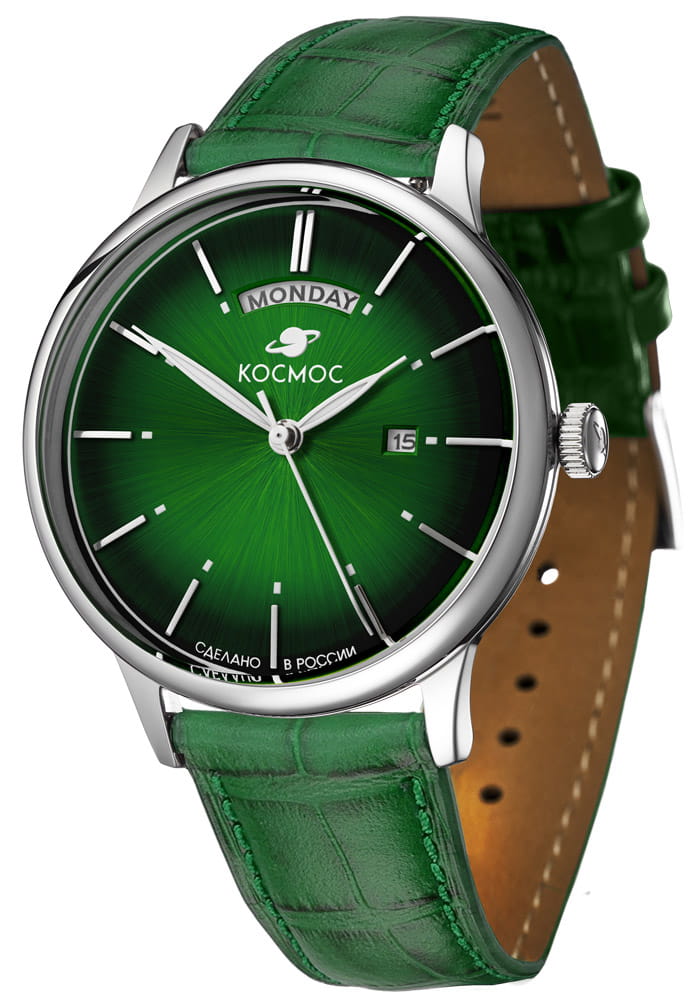 Мужские наручные часы Космос Орион K 011.17.38 — это сочетание традиций часового искусства 60-70-х годов и футуристического дизайна, вдохновленного космическими исследованиями. Они не только служат напоминанием о прошлом, но и побуждают задуматься о будущем, позволяя наслаждаться качеством и смыслом, вложенными в каждую деталь. Полированный корпус часов выполнен в виде силуэта летающей тарелки благодаря выпуклым формам стекла и нижней части корпуса. Стальные ушки, которые напоминают опоры летающей тарелки, завершает общий образ. На задней крышке часов выгравирован фантазийный сюжет – космическая станция будущего. Зеленый циферблат, выполненный в ретро-стиле, имеет выгнутые края, что требует использования сложной технологии производства. Такой дизайн был характерен для часов прошлых эпох. Секундная стрелка, имеющая изогнутую форму, идеально соответствует контуру циферблата. Выпуклый градиентный циферблат с шлифовкой, напоминающей солнечные лучи, украшен вручную изготовленными индексами, которые надежно крепятся на двух штифтах. Часовая и минутная стрелки, а также линия по краю циферблата, напоминающая ореол Земли, имеют люминесцентное покрытиеЛюминесцентное покрытиеПозволяет считывать показания времени в темноте. Производители наносят на стрелки, часовые индексы, безель или поверхность циферблата светонакопительный состав, дающий холодное свечение., которое светится в темноте, создавая впечатляющий визуальный эффект. В верхней части циферблата расположено окошко для отображения дня недели на английском языке, а индикаторы даты и дня недели дополнительно украшены фасочками, что придает им элегантный вид. Форма минерального стеклаМинеральное стеклоМинеральное стекло представляет собой искусственно выращенный минерал кварца. Такое стекло отличается особой устойчивостью к повреждениям и царапинам. Уступает по некоторым качествам сапфировому стеклу. также тщательно продумана, оно изогнуто как снаружи, так и изнутри. Это позволяет избежать искажений изображения на циферблате, в отличие от традиционного стекла с прямой внутренней частью, создающего эффект линзы. Ремешок из натуральной кожи зеленого цвета прекрасно дополняет часы. Также имеется возможность приобрести дополнительные ремни и браслеты миланского плетения, которые можно легко менять благодаря специальным крепежам. Заводная головка, застежка и ремешок украшены фирменным логотипом, подчеркивающим индивидуальность и стиль модели.