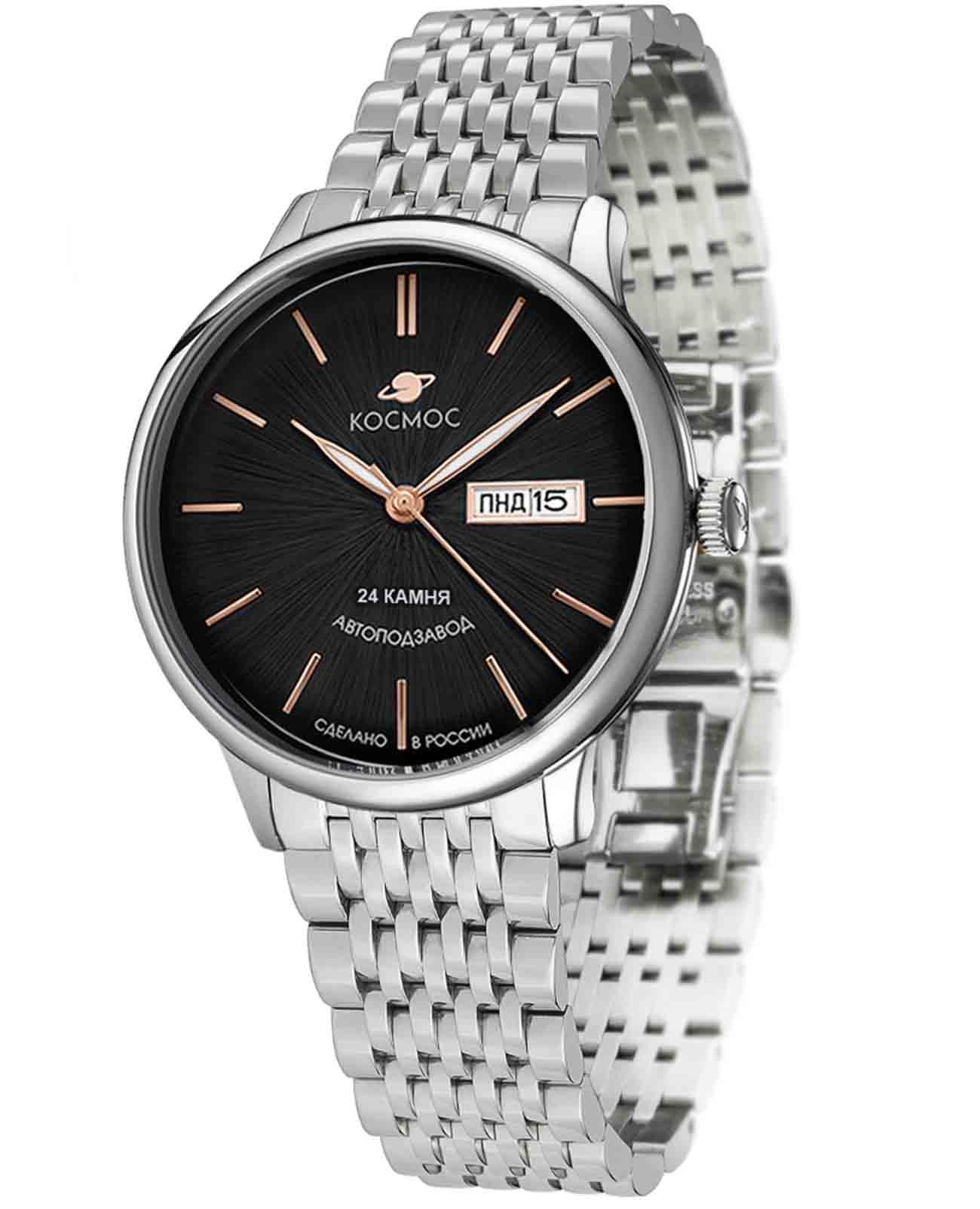 Российские мужские механические часы Космос K 043.19.35 из коллекции Юпитер оснащены механизмом TMI с автоподзаводом. Круглый корпус из нержавеющей стали диаметром 41 мм защищен минеральным стекломМинеральное стеклоМинеральное стекло представляет собой искусственно выращенный минерал кварца. Такое стекло отличается особой устойчивостью к повреждениям и царапинам. Уступает по некоторым качествам сапфировому стеклу.. Циферблат дополнен функциями отображения даты и дня недели. Часы имеют водонепроницаемость 50 метров, позволит защитить корпус от случайных брызг или капель дождя. Модель комплектуется стальным браслетом на застёжке-бабочке с кнопкамиЗастёжка "бабочка"Такой вид застёжки дополняется предохранителями, помогающими избежать случайного раскрытия браслета. Обладают изящным исполнением. . Прочный корпус и надежный механизм делают эти часы универсальным аксессуаром для повседневного использования. Уникальный дизайн и высокое качество материалов подчеркивают индивидуальность владельца.
