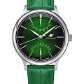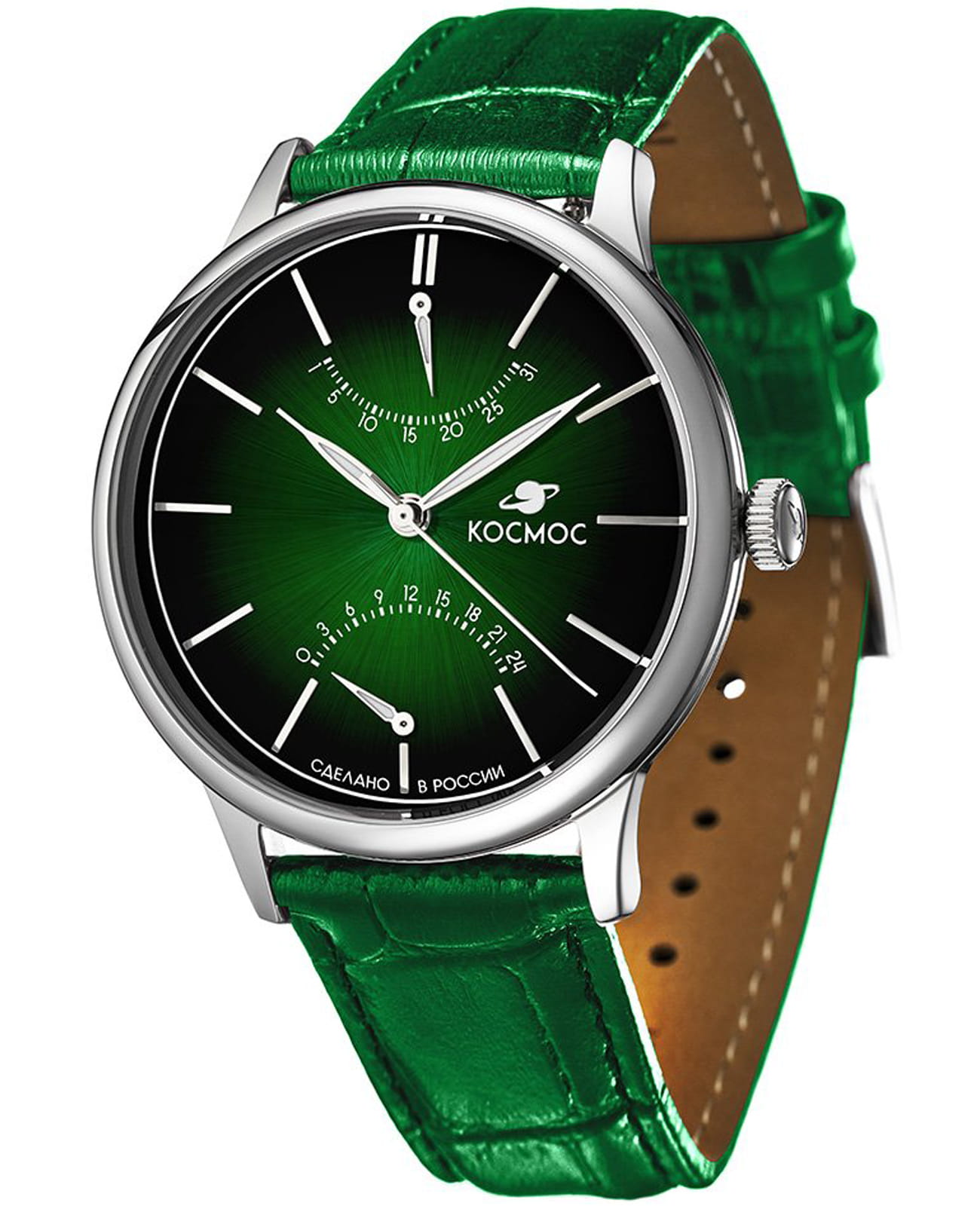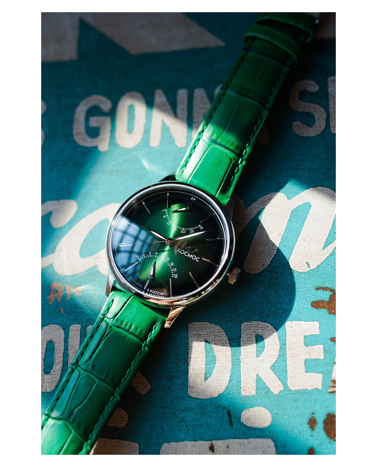 Мужские наручные часы Космос Космопорт K 058.17.38 — это сочетание традиций часового искусства 60-70-х годов и футуристического дизайна, вдохновленного космическими исследованиями. Они не только служат напоминанием о прошлом, но и побуждают задуматься о будущем, позволяя наслаждаться качеством и смыслом, вложенными в каждую деталь. Полированный корпус часов выполнен в виде силуэта летающей тарелки благодаря выпуклым формам стекла и нижней части корпуса. Стальные ушки, которые напоминают опоры летающей тарелки, завершает общий образ. На задней крышке часов выгравирован фантазийный сюжет – космическая станция будущего. Циферблат зеленого цвета выполнен в ретро стиле с закруглёнными краями, что требует применения сложной технологии производства, характерной для часов прошлых лет. Кончик секундной стрелки повторяет эту форму, а на выпуклом градиентном циферблате выполнена шлифовка, напоминающая солнечные лучи. Индексы, изготовленные вручную и закрепленные на двух штифтах, добавляют изысканности. Также присутствуют ретроградные индикаторы даты и второго времени (24 часа), которые возвращаются в исходное положение одним движением. Люминесцентное покрытиеЛюминесцентное покрытиеПозволяет считывать показания времени в темноте. Производители наносят на стрелки, часовые индексы, безель или поверхность циферблата светонакопительный состав, дающий холодное свечение. на часовой и минутной стрелках, а также на стрелках ретроградных индикаторов и окантовке циферблата создает эффект светящегося ореола в темноте. Форма минерального стеклаМинеральное стеклоМинеральное стекло представляет собой искусственно выращенный минерал кварца. Такое стекло отличается особой устойчивостью к повреждениям и царапинам. Уступает по некоторым качествам сапфировому стеклу., представляющего собой двояковыпуклую конструкцию, тщательно проработана. Такое стекло не искажает изображение на циферблате, потому что внутренняя поверхность остаётся плоской, создавая эффект линзы. Производственный процесс для достижения двух параллельно изогнутых поверхностей очень сложен, и требуется высокая точность, чтобы избежать повреждения стекла. Ремешок из зеленой натуральной кожи оснащён креплениями, которые позволяют легко снимать и надевать его без использования дополнительных инструментов. Заводная головка, застежка и ремешок украшены фирменным логотипом, что подчеркивает индивидуальность и стиль этих часов.