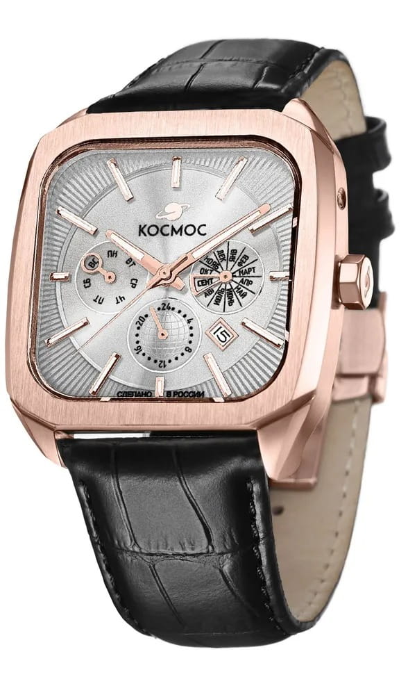Мужские наручные часы Космос Марсоход II K 219.41.33 — это уникальная лимитированная серия, посвященная аппарату, способному передвигаться по поверхности Красной планеты. Марсоход ассоциируется с брутальностью, мастерством и технической сложностью. Наша страна дважды запускала подобные аппараты еще в 70-х годах прошлого века. Дизайн часов серии Марсоход вдохновлен лучшими работами советских мастеров, сочетая современные технологии часового искусства с обаянием стиля ретро. Корпус в форме квадрата с закругленными углами выполнен из нержавеющей стали с PVDPVDУльтратонкое покрытие наносится в технике вакуумного напыления, сочетает в себе нитрид титана особой прочности со слоем золота или оксида хрома. Несёт в себе декоративную или защитную функцию. покрытием украшен зеркальной полировкой и сатинированием. Удобная заводная головка имеет форму гайки, что добавляет модели индустриальный шарм. Задняя крышка прозрачная, закрепленная на четырех винтах, и позволяет увидеть работу механизма TMI с подвижным ротором, на котором гравируется надпись «Сделано в России». Также здесь представлена гравировка с изображением космонавта, придающая часам особую значимость. Водостойкость достигает 10 атм (WR100), что позволяет использовать часы при плавании и других водных видах спорта. На задней крышке указан индивидуальный номер модели в формате от 01/50 до 50/50. Объемный циферблат состоит из двух уровней. В центре движутся три стрелки, часовая и минутная из которых имеют люминесцентное покрытиеЛюминесцентное покрытиеПозволяет считывать показания времени в темноте. Производители наносят на стрелки, часовые индексы, безель или поверхность циферблата светонакопительный состав, дающий холодное свечение., позволяющее определять время даже в темноте. Также, здесь расположили три дополнительных индикатора: день недели, месяц и время в формате 24-х часов. Для обозначения дня недели и месяца используется кириллица. Окошко даты между 4 и 5 часами выделено накладной рамкой. Циферблат защищен прочным сапфировым стеклом с антибликовым покрытиемСапфировое стеклоПрочный и надёжный материал из кристалла сапфира синтетического происхождения, характеризующийся особой твёрдостью и устойчивостью к царапинам и повреждениям., обеспечивающим отличную читаемость показаний в любых условиях. Второй уровень декорирован гильоше в виде солнечных лучей, на нем закреплены накладные индексы. Браслет изготовлен из натуральной кожи черного цвета и оснащен удобной застёжкой «бабочка» с кнопкамиЗастёжка "бабочка"Такой вид застёжки дополняется предохранителями, помогающими избежать случайного раскрытия браслета. Обладают изящным исполнением. , которая сводит к минимуму вероятность потери. Заводная головка, застежка и браслет украшены фирменным логотипом бренда. Коллекция Марсоход — идеальный выбор для ценителей истории космических достижений и современных технологий.