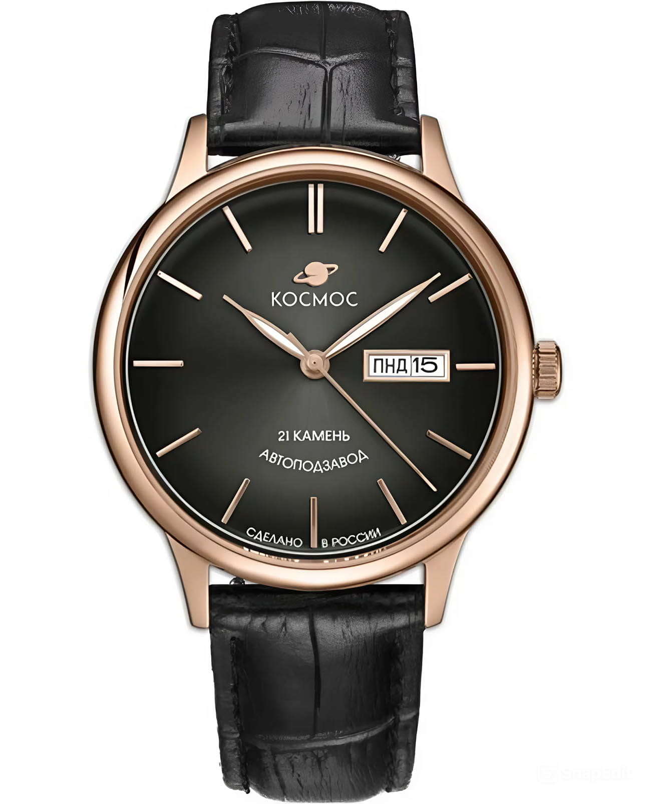 Мужские наручные часы Космос Телескоп K 304.41.31 — это уникальная лимитированная серия под названием Телескоп, посвящена аппарату приоткрывающего взгляду бескрайние дали космического пространства. Апертура открытого баланса модели по форме напоминает круглую линзу телескопа. Сквозь это окошко, расположенное на черном циферблате, также можно увидеть много интересного: ту самую систему «баланс-спираль» автоматического механизма, которая отвечает за точность хода. Корпус часов выполнен из нержавеющей стали с PVDPVDУльтратонкое покрытие наносится в технике вакуумного напыления, сочетает в себе нитрид титана особой прочности со слоем золота или оксида хрома. Несёт в себе декоративную или защитную функцию. покрытием, классической круглой формы и достаточно тонкий для механических моделей. Это стало возможным благодаря использованию механизма Miyota, калибр 9029, с высотой всего 3.9 мм. Циферблат декорирован вертикальной текстурой в ретро-стиле, по которой движутся крупные часовая и минутная стрелки, имеющие люминесцентное покрытиеЛюминесцентное покрытиеПозволяет считывать показания времени в темноте. Производители наносят на стрелки, часовые индексы, безель или поверхность циферблата светонакопительный состав, дающий холодное свечение., позволяющее определять время даже в темноте. Циферблат защищен прочным сапфировым стеклом с антибликовым покрытиемСапфировое стеклоПрочный и надёжный материал из кристалла сапфира синтетического происхождения, характеризующийся особой твёрдостью и устойчивостью к царапинам и повреждениям., обеспечивающим отличную читаемость показаний в любых условиях. Прозрачная задняя крышка, закрепленная на четырех винтах, демонстрирует механизм и содержит выгравированный индивидуальный номер экземпляра хх/50, отражающий лимитированный тираж всего в 50 штук. Ремешок часов сделан из натуральной кожи черного цвета и оснащен удобной застёжкой «бабочка» с кнопкамиЗастёжка "бабочка"Такой вид застёжки дополняется предохранителями, помогающими избежать случайного раскрытия браслета. Обладают изящным исполнением. , которая сводит к минимуму вероятность потери. Модель Телескоп сочетает классический дизайн и универсальность, прекрасно подходя как к деловому костюму, так и к более повседневным образам.