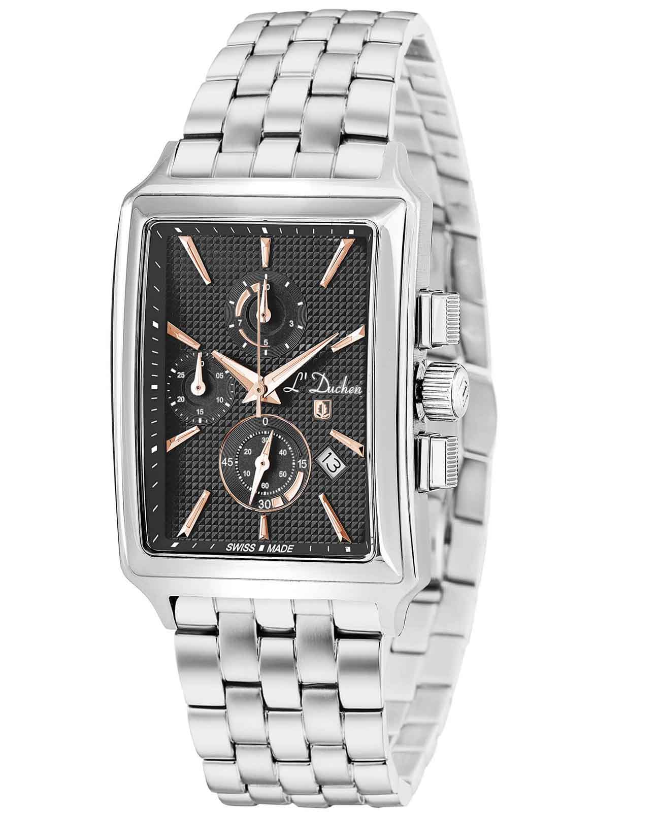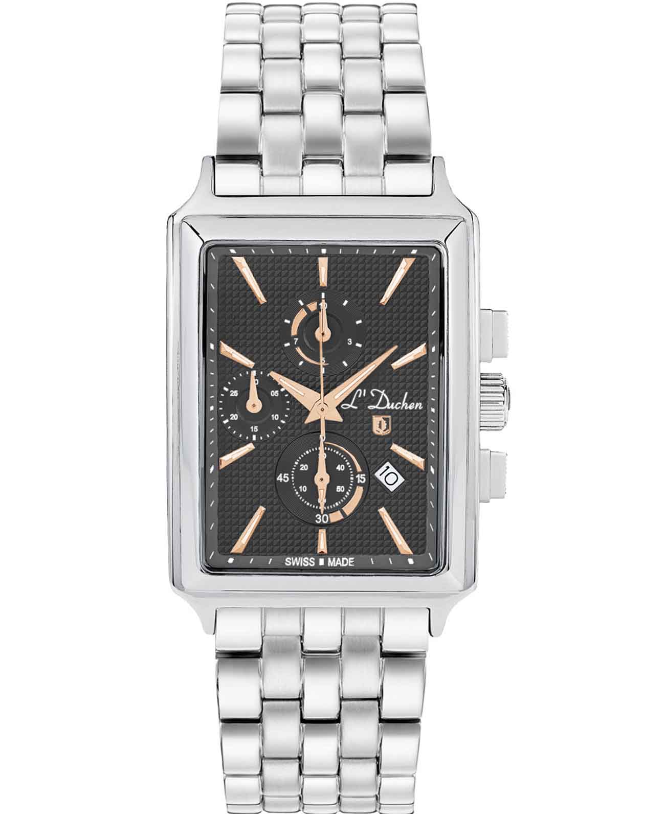 Мужские швейцарские часы- хронографХронографФункция позволяет измерять отрезки времени с особой точностью: часы, минуты, секунды. Верным признаком хронографа является наличие на циферблате 3 дополнительных окошек-счётчиков. L'Duchen Adventure Chrono D 612.10.32, кварцевый механизм с высокой точностью. Сапфировое стеклоСапфировое стеклоПрочный и надёжный материал из кристалла сапфира синтетического происхождения, характеризующийся особой твёрдостью и устойчивостью к царапинам и повреждениям. устойчивое к появлению царапин, обладающее высокой прозрачностью. Корпус часов выполнен из нержавеющей стали. Стрелки с люминесцентным покрытиемЛюминесцентное покрытиеПозволяет считывать показания времени в темноте. Производители наносят на стрелки, часовые индексы, безель или поверхность циферблата светонакопительный состав, дающий холодное свечение.. Окошко даты находится в положении между 4 и 5 часами. Класс водозащиты: 50 метров, позволит защитить корпус от случайных брызг или капель дождя. Стальной браслет на застёжке «бабочка» с кнопкамиЗастёжка "бабочка"Такой вид застёжки дополняется предохранителями, помогающими избежать случайного раскрытия браслета. Обладают изящным исполнением. .