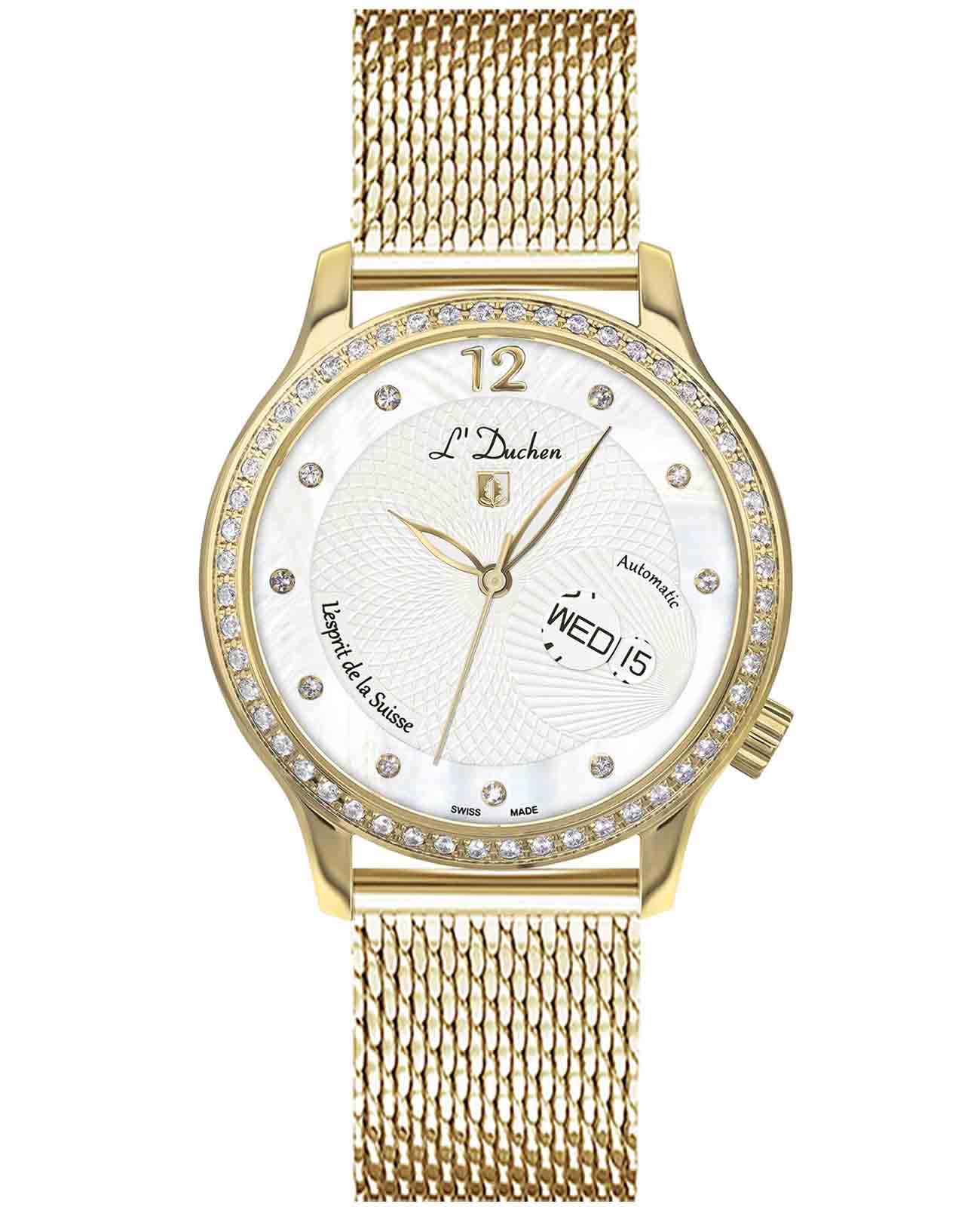 Женские швейцарские механические часы с автоподзаводом L'Duchen Coquille D 713.26.33 M. Сапфировое стеклоСапфировое стеклоПрочный и надёжный материал из кристалла сапфира синтетического происхождения, характеризующийся особой твёрдостью и устойчивостью к царапинам и повреждениям. устойчивое к появлению царапин, обладающее высокой прозрачностью. Корпус часов выполнен из нержавеющей стали с PVD-покрытиемPVDУльтратонкое покрытие наносится в технике вакуумного напыления, сочетает в себе нитрид титана особой прочности со слоем золота или оксида хрома. Несёт в себе декоративную или защитную функцию.. БезельБезельВнешний ободок, закрепляющий стекло. В спортивных часах так называется поворотное кольцо с делениями на циферблате, выполняет роль таймера – замеряет отрезки времени на шкале. Неподвижный безель – элемент декора. Однонаправленно вращающийся безель на дайверских часах позволяет фиксировать моменты погружения и выныривания на поверхность. и циферблат украшены фианитами. Стрелки с люминесцентным покрытиемЛюминесцентное покрытиеПозволяет считывать показания времени в темноте. Производители наносят на стрелки, часовые индексы, безель или поверхность циферблата светонакопительный состав, дающий холодное свечение.. Класс водозащиты: 50 метров, позволит защитить корпус от случайных брызг или капель дождя. Стальной браслет миланского плетения с PVD-покрытиемPVDУльтратонкое покрытие наносится в технике вакуумного напыления, сочетает в себе нитрид титана особой прочности со слоем золота или оксида хрома. Несёт в себе декоративную или защитную функцию. на раскладном замкеРаскладной замокДанный вариант застежки используется только на часах с металлическим браслетом. Отличительная особенность такого крепления в том, что длина браслета становится универсальной и вы можете самостоятельно отрегулировать нужный вам размер – застежка просто двигается по браслету часов..