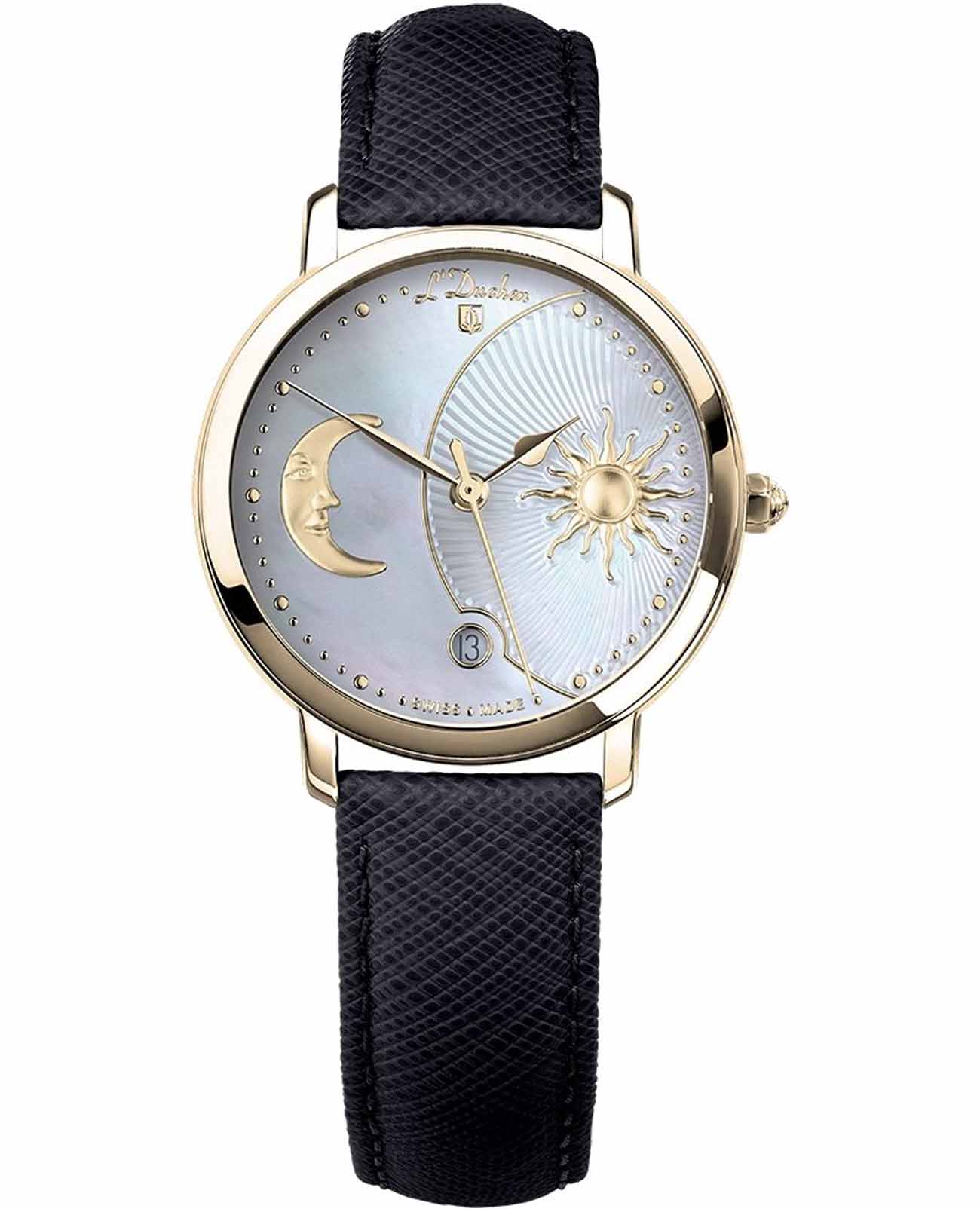 Женские швейцарские часы L'Duchen Day & Night D 781.21.33, кварцевый механизм с высокой точностью. Сапфировое стеклоСапфировое стеклоПрочный и надёжный материал из кристалла сапфира синтетического происхождения, характеризующийся особой твёрдостью и устойчивостью к царапинам и повреждениям. устойчивое к появлению царапин, обладающее высокой прозрачностью. Корпус часов выполнен из нержавеющей стали с PVD-покрытиемPVDУльтратонкое покрытие наносится в технике вакуумного напыления, сочетает в себе нитрид титана особой прочности со слоем золота или оксида хрома. Несёт в себе декоративную или защитную функцию.. Окошко даты находится в положении 6 часов. Класс водозащиты: 50 метров, позволит защитить корпус от случайных брызг или капель дождя. Кожаный ремешок на застёжке «бабочка» с кнопкамиЗастёжка "бабочка"Такой вид застёжки дополняется предохранителями, помогающими избежать случайного раскрытия браслета. Обладают изящным исполнением. .