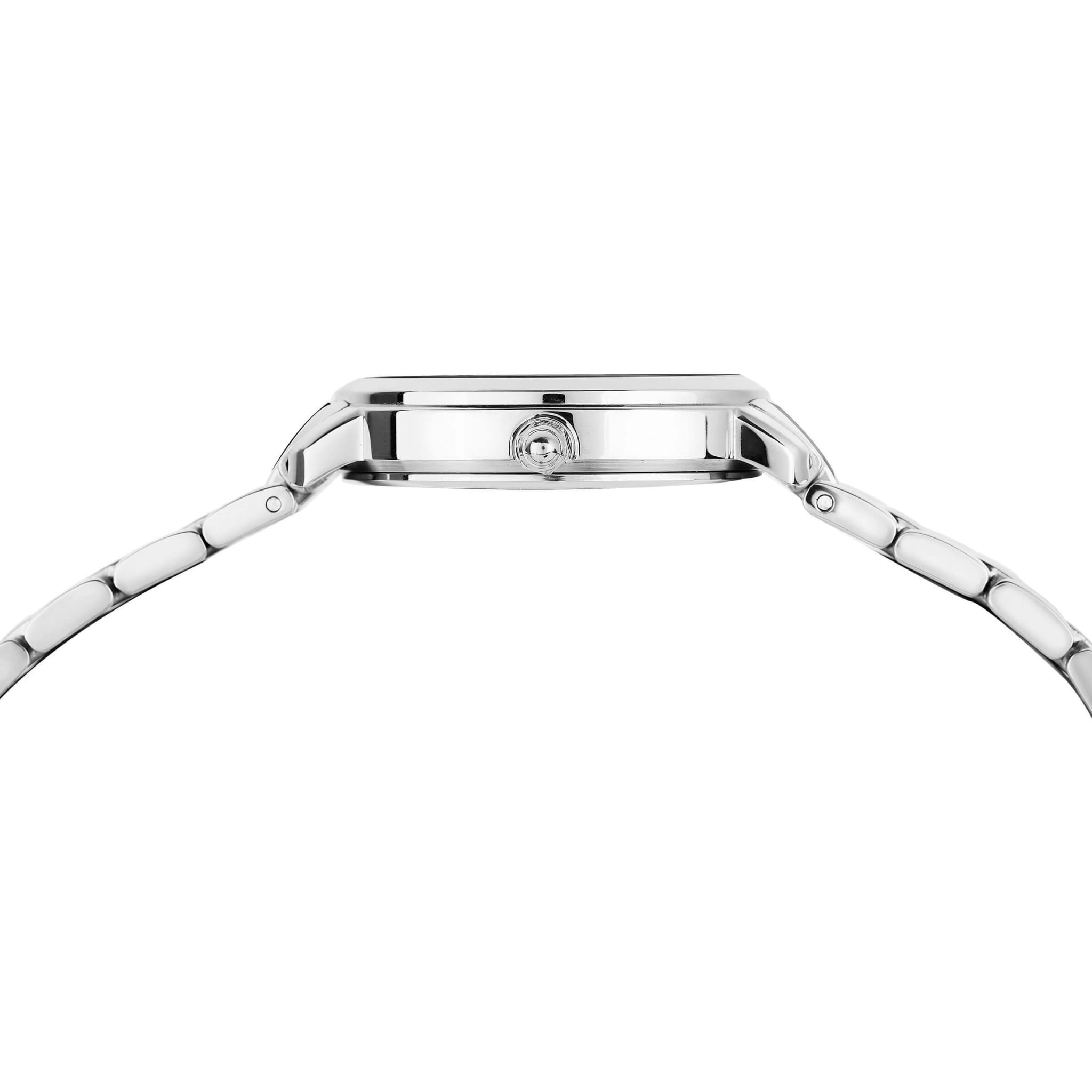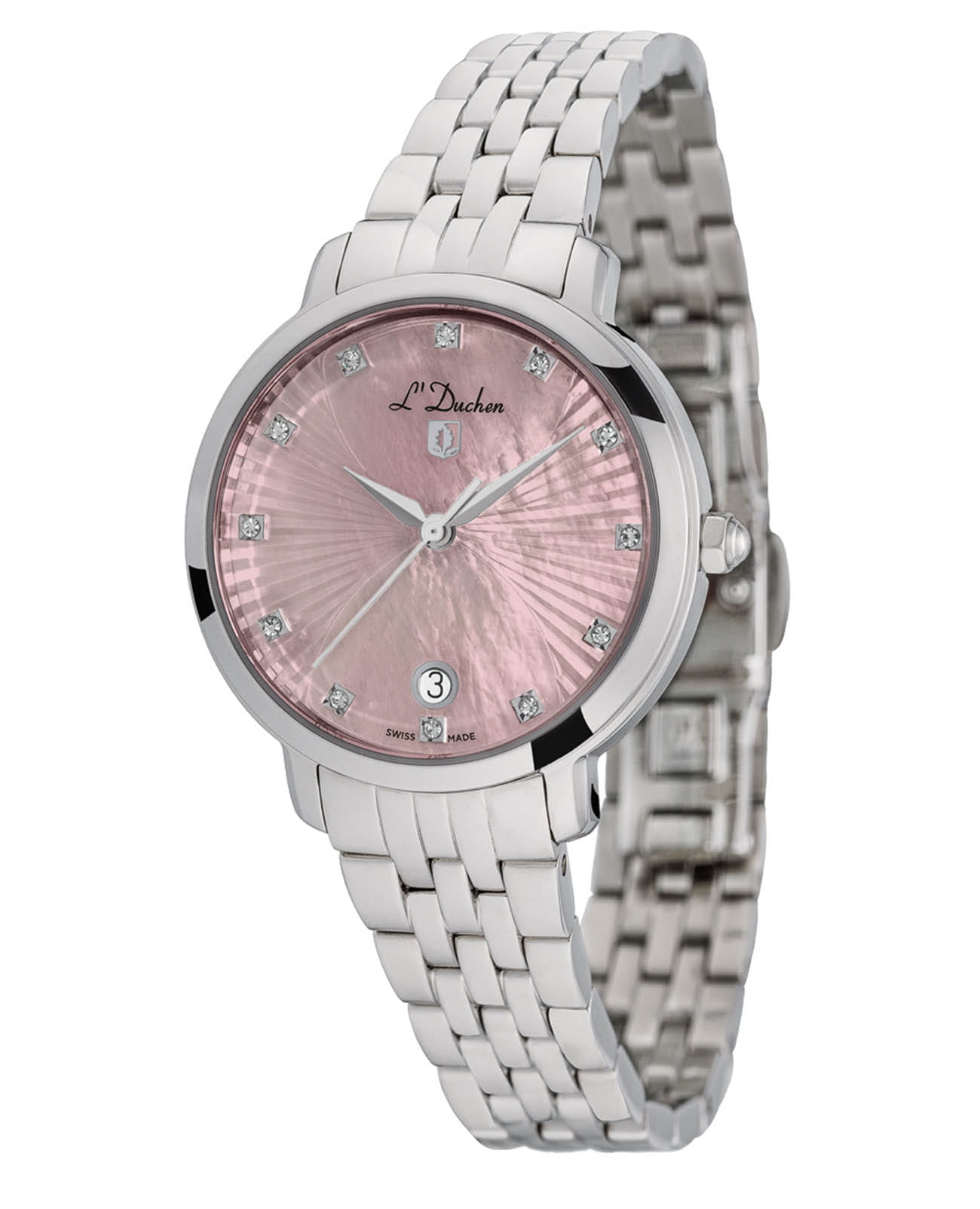Женские кварцевые часы L'Duchen из коллекции Eternity — это изысканный аксессуар, подчеркивающий утончённость и женственность. Корпус диаметром 32 мм выполнен из нержавеющей стали 316L, а циферблат защищён сапфировым стекломСапфировое стеклоПрочный и надёжный материал из кристалла сапфира синтетического происхождения, характеризующийся особой твёрдостью и устойчивостью к царапинам и повреждениям.. Циферблат розового цвета изготовлен из натурального перламутра, придающего модели благородное сияние. Центральная часть украшена декоративным узором гильоше и инкрустирована 12 фианитами, добавляющими изысканное мерцание. Окошко даты расположено в положении 6 часов. Часы оснащены стальным браслетом на застёжке «бабочка» с кнопкамиЗастёжка "бабочка"Такой вид застёжки дополняется предохранителями, помогающими избежать случайного раскрытия браслета. Обладают изящным исполнением. . Водонепроницаемость 50 м позволяет использовать часы в повседневных условиях.