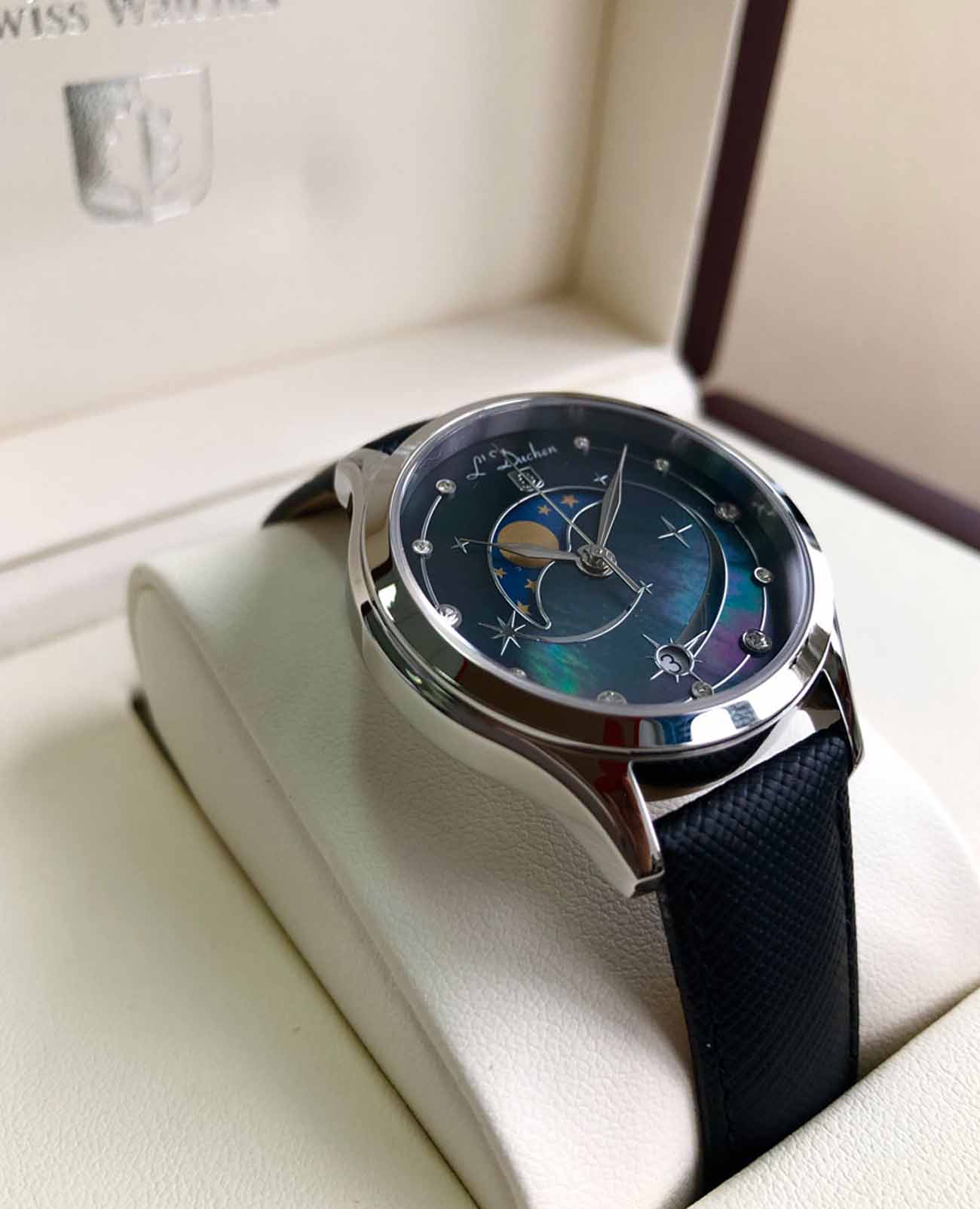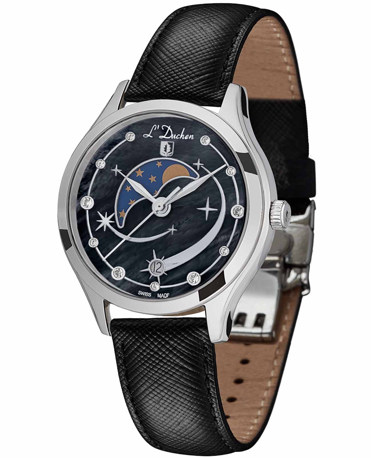 Женские швейцарские часы L'Duchen Perseides D 837.11.41, кварцевый механизм с высокой точностью. Сапфировое стеклоСапфировое стеклоПрочный и надёжный материал из кристалла сапфира синтетического происхождения, характеризующийся особой твёрдостью и устойчивостью к царапинам и повреждениям. устойчивое к появлению царапин, обладающее высокой прозрачностью. Корпус часов выполнен из нержавеющей стали. Циферблат украшен фианитами. Класс водозащиты: 50 метров, позволит защитить корпус от случайных брызг или капель дождя. Кожаный ремешок на застёжке «бабочка» с кнопкамиЗастёжка "бабочка"Такой вид застёжки дополняется предохранителями, помогающими избежать случайного раскрытия браслета. Обладают изящным исполнением. .