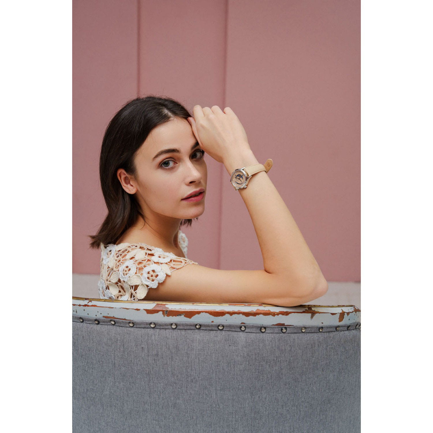 Женские кварцевые часы L'Duchen из коллекции Perseides — это волшебный аксессуар, вдохновлённый космическим зрелищем метеорного потока. Корпус диаметром 34 мм выполнен из нержавеющей стали 316L с эффектным чередованием полированных и матовых поверхностей. Циферблат нежного бежевого цвета изготовлен из натурального перламутра, природная текстура которого создаёт уникальный фон. Центральная композиция украшена накладными элементами и фианитами разного размера, символизирующими падающие звёзды метеорного потока Персеиды. Окошко даты в верхней части циферблата оформлено в виде звезды, а указатель фазы луны элегантно выделен металлической рамкой. Циферблат защищён сапфировым стекломСапфировое стеклоПрочный и надёжный материал из кристалла сапфира синтетического происхождения, характеризующийся особой твёрдостью и устойчивостью к царапинам и повреждениям.. Часы оснащены ремешком из натуральной кожи бежевого цвета и застёжкой «бабочка» с кнопкамиЗастёжка "бабочка"Такой вид застёжки дополняется предохранителями, помогающими избежать случайного раскрытия браслета. Обладают изящным исполнением. , украшенной логотипом бренда — дубовым листом, символом мудрости и долговечности. Заводная головка и задняя крышка также декорированы фирменным тиснением. Водонепроницаемость 50 м позволяет использовать часы в повседневных условиях.