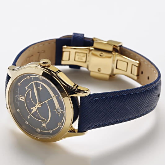 Женские швейцарские часы L'Duchen Perseides D 837.23.47, кварцевый механизм с высокой точностью. Сапфировое стеклоСапфировое стеклоПрочный и надёжный материал из кристалла сапфира синтетического происхождения, характеризующийся особой твёрдостью и устойчивостью к царапинам и повреждениям. устойчивое к появлению царапин, обладающее высокой прозрачностью. Корпус часов выполнен из нержавеющей стали с PVD-покрытиемPVDУльтратонкое покрытие наносится в технике вакуумного напыления, сочетает в себе нитрид титана особой прочности со слоем золота или оксида хрома. Несёт в себе декоративную или защитную функцию.. Циферблат украшен фианитами. Класс водозащиты: 50 метров, позволит защитить корпус от случайных брызг или капель дождя. Кожаный ремешок на застёжке «бабочка» с кнопкамиЗастёжка "бабочка"Такой вид застёжки дополняется предохранителями, помогающими избежать случайного раскрытия браслета. Обладают изящным исполнением. .