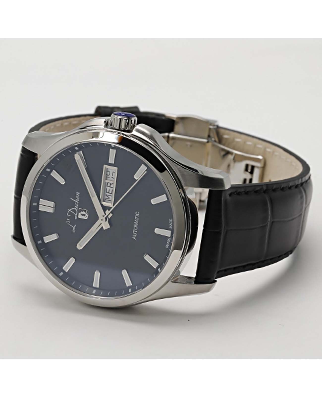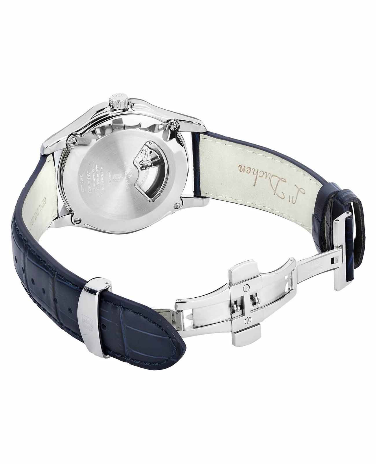 Мужские механические швейцарские часы с автоподзаводом L'Duchen Dynamique D 843.11.31. Сапфировое стеклоСапфировое стеклоПрочный и надёжный материал из кристалла сапфира синтетического происхождения, характеризующийся особой твёрдостью и устойчивостью к царапинам и повреждениям. устойчивое к появлению царапин, обладающее высокой прозрачностью. Корпус часов выполнен из нержавеющей стали. Стрелки с люминесцентным покрытиемЛюминесцентное покрытиеПозволяет считывать показания времени в темноте. Производители наносят на стрелки, часовые индексы, безель или поверхность циферблата светонакопительный состав, дающий холодное свечение.. Окошко даты находится в положении 3 часа. Класс водозащиты: 100 метров, позволит плавать, нырять и заниматься другими водными видами спорта. Кожаный ремешок на застёжке «бабочка» с кнопкамиЗастёжка "бабочка"Такой вид застёжки дополняется предохранителями, помогающими избежать случайного раскрытия браслета. Обладают изящным исполнением. .
