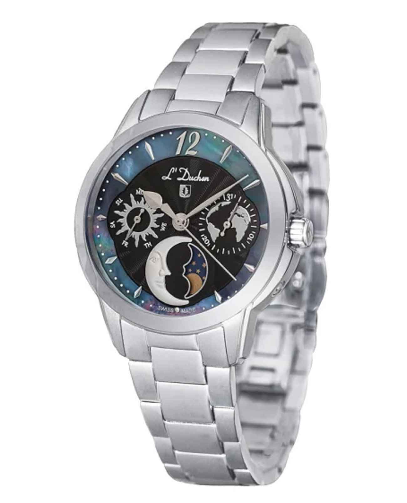 Женские швейцарские кварцевые часы L'Duchen Celeste D 857.10.31. Сапфировое стеклоСапфировое стеклоПрочный и надёжный материал из кристалла сапфира синтетического происхождения, характеризующийся особой твёрдостью и устойчивостью к царапинам и повреждениям. устойчивое к появлению царапин, обладающее высокой прозрачностью. Корпус часов выполнен из нержавеющей стали. Число и день недели вынесены на отдельные циферблаты. Указатель фаз Луны находится в положении 6 часов. Класс водозащиты: 50 метров, позволит защитить корпус от случайных брызг или капель дождя. Стальной браслет на застёжке-бабочке с кнопкамиЗастёжка "бабочка"Такой вид застёжки дополняется предохранителями, помогающими избежать случайного раскрытия браслета. Обладают изящным исполнением. .