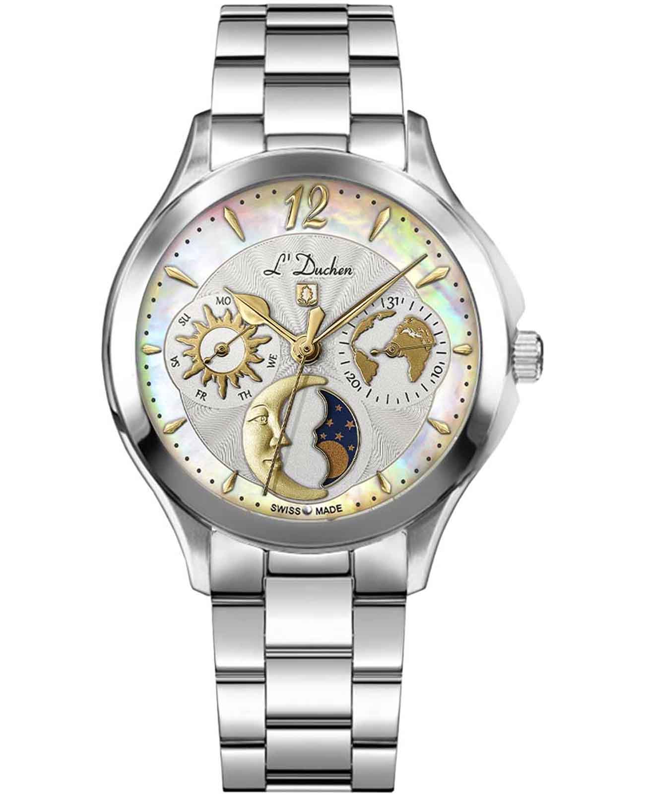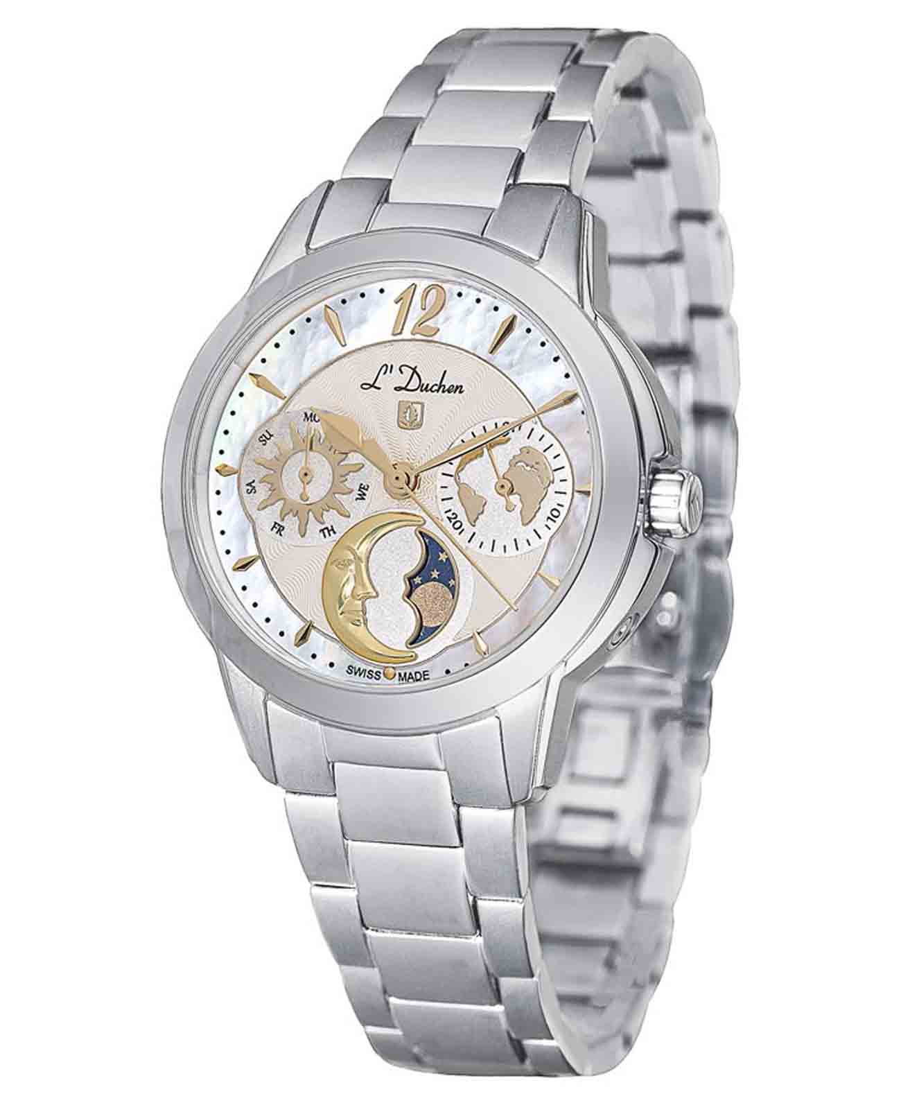 Женские швейцарские кварцевые часы L'Duchen Celeste D 857.10.32. Сапфировое стеклоСапфировое стеклоПрочный и надёжный материал из кристалла сапфира синтетического происхождения, характеризующийся особой твёрдостью и устойчивостью к царапинам и повреждениям. устойчивое к появлению царапин, обладающее высокой прозрачностью. Корпус часов выполнен из нержавеющей стали. Число и день недели вынесены на отдельные циферблаты. Указатель фаз Луны находится в положении 6 часов. Класс водозащиты: 50 метров, позволит защитить корпус от случайных брызг или капель дождя. Стальной браслет на застёжке-бабочке с кнопкамиЗастёжка "бабочка"Такой вид застёжки дополняется предохранителями, помогающими избежать случайного раскрытия браслета. Обладают изящным исполнением. .
