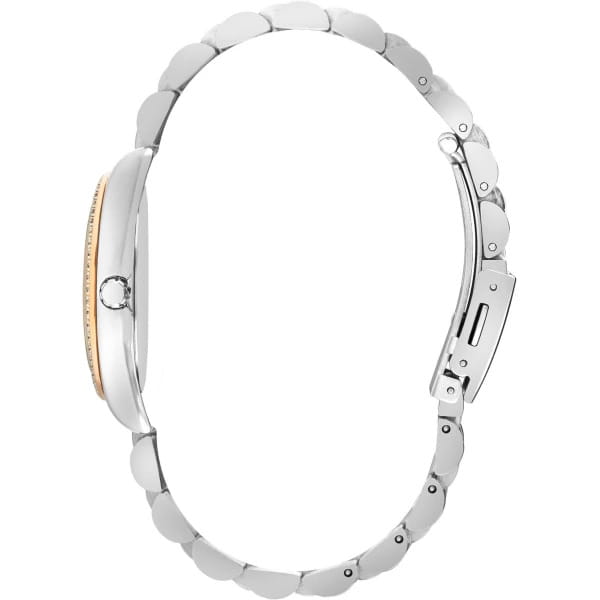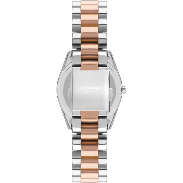 Женские наручные часы Lee Cooper LC07478.520 — это элегантная модель с утончённым дизайном. Корпус диаметром 34 мм выполнен из суперметалла, что придаёт часам изысканный вид. Перламутровый циферблат украшен изящными стрелками и вставками из циркония в виде меток, обеспечивая удобное считывание времени. Циферблат защищён минеральным стекломМинеральное стеклоМинеральное стекло представляет собой искусственно выращенный минерал кварца. Такое стекло отличается особой устойчивостью к повреждениям и царапинам. Уступает по некоторым качествам сапфировому стеклу., устойчивым к царапинам. Часы работают на кварцевом механизме, обеспечивая точность хода. Браслет из нержавеющей стали с раскладной застёжкойРаскладная застёжкаТакой тип застёжки используется только на браслетах из металла. Она никогда не раскрывается полностью, происходит разделение на 2 и более частей. Раскладывающая застёжка снизит вероятность потери часов к минимуму. гарантирует комфортное ношение и надёжную фиксацию на запястье. Водозащита 30 метров защищает часы от случайных брызг и дождя, делая их подходящими для повседневного использования. БезельБезельВнешний ободок, закрепляющий стекло. В спортивных часах так называется поворотное кольцо с делениями на циферблате, выполняет роль таймера – замеряет отрезки времени на шкале. Неподвижный безель – элемент декора. Однонаправленно вращающийся безель на дайверских часах позволяет фиксировать моменты погружения и выныривания на поверхность. с  IP-покрытиемIP-покрытиеМетод ионного напыления. Демонстрирует повышенную устойчивость к истиранию, окислению и химическим веществам. Под воздействием высокого давления и температуры около 1500°C молекулы металла надёжно соединяются с частицами корпуса часов. инкрустирован кристаллами. Стрелки покрыты люминесцентным покрытиемЛюминесцентное покрытиеПозволяет считывать показания времени в темноте. Производители наносят на стрелки, часовые индексы, безель или поверхность циферблата светонакопительный состав, дающий холодное свечение., обеспечивая удобное считывание показаний в условиях недостаточного освещения.