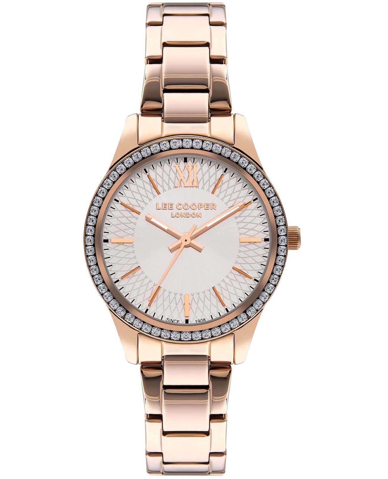 Женские часы Lee Cooper LC07569.430 — это стильное сочетание элегантности и современного дизайна. Круглый корпус диаметром 34 мм выполнен из суперметалла с IP-покрытиемIP-покрытиеМетод ионного напыления. Демонстрирует повышенную устойчивость к истиранию, окислению и химическим веществам. Под воздействием высокого давления и температуры около 1500°C молекулы металла надёжно соединяются с частицами корпуса часов. цвета розового золота. Неподвижный безельБезельВнешний ободок, закрепляющий стекло. В спортивных часах так называется поворотное кольцо с делениями на циферблате, выполняет роль таймера – замеряет отрезки времени на шкале. Неподвижный безель – элемент декора. Однонаправленно вращающийся безель на дайверских часах позволяет фиксировать моменты погружения и выныривания на поверхность. инкрустирован цирконами, что придает модели особый блеск. Серебристый циферблат защищен минеральным стекломМинеральное стеклоМинеральное стекло представляет собой искусственно выращенный минерал кварца. Такое стекло отличается особой устойчивостью к повреждениям и царапинам. Уступает по некоторым качествам сапфировому стеклу., обеспечивающим устойчивость к царапинам. Часы оснащены надежным кварцевым механизмом, а металлический браслет с IP-покрытиемIP-покрытиеМетод ионного напыления. Демонстрирует повышенную устойчивость к истиранию, окислению и химическим веществам. Под воздействием высокого давления и температуры около 1500°C молекулы металла надёжно соединяются с частицами корпуса часов. на раскладной застёжкеРаскладная застёжкаТакой тип застёжки используется только на браслетах из металла. Она никогда не раскрывается полностью, происходит разделение на 2 и более частей. Раскладывающая застёжка снизит вероятность потери часов к минимуму. гарантирует комфортную посадку на запястье. Стрелки с люминесцентным покрытиемЛюминесцентное покрытиеПозволяет считывать показания времени в темноте. Производители наносят на стрелки, часовые индексы, безель или поверхность циферблата светонакопительный состав, дающий холодное свечение. позволяют легко считывать время даже в условиях недостаточного освещения. Водозащита 30 метров защищает модель от случайных брызг и дождя. Lee Cooper — отличный выбор для тех, кто ценит утонченность и качество.
