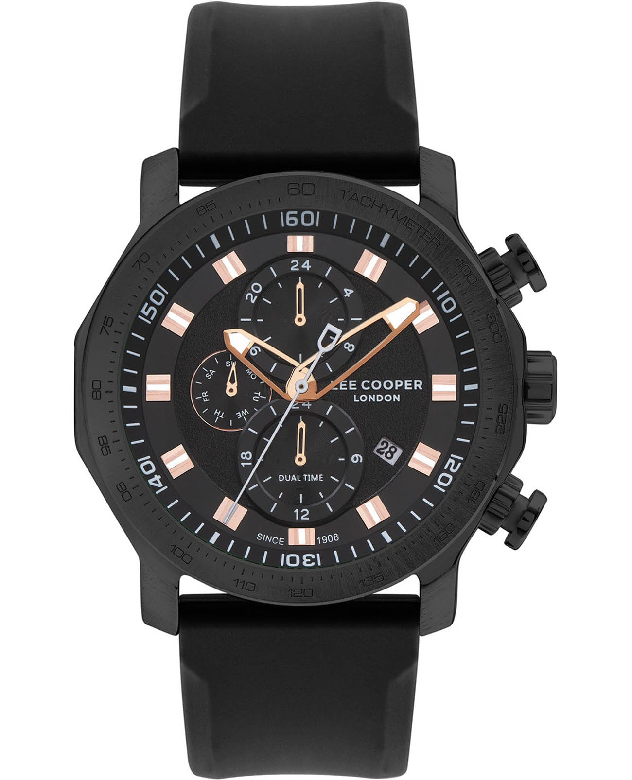 Lee Cooper LC07631.651 — элегантная модель с функциональными возможностями для повседневного использования. Корпус из суперметалла с IP-покрытиемIP-покрытиеМетод ионного напыления. Демонстрирует повышенную устойчивость к истиранию, окислению и химическим веществам. Под воздействием высокого давления и температуры около 1500°C молекулы металла надёжно соединяются с частицами корпуса часов. черного цвета и диаметром 49 мм придаёт часам классический и современный вид. Циферблат защищён минеральным стекломМинеральное стеклоМинеральное стекло представляет собой искусственно выращенный минерал кварца. Такое стекло отличается особой устойчивостью к повреждениям и царапинам. Уступает по некоторым качествам сапфировому стеклу., устойчивым к царапинам, хорошо может выдержать небольшие удары и падения. Стильный циферблат оформлен изысканными индексами и дополнен окошками даты, дня недели и 24-часового индикатора, а также аккуратными метками и стрелками с люминесцентным покрытиемЛюминесцентное покрытиеПозволяет считывать показания времени в темноте. Производители наносят на стрелки, часовые индексы, безель или поверхность циферблата светонакопительный состав, дающий холодное свечение., что гарантирует читаемость даже в условиях недостаточного освещения. Функция второго часового поясаВторой часовой поясФункция, позволяющая отображать время двух часовых поясов одновременно. делает часы удобными для путешественников. Часы работают на кварцевом механизме, обеспечивающем точность хода. Каучуковый ремешок на стандартной застёжке гарантирует удобную посадку и надёжную фиксацию на запястье. Водозащита 50 метров защищает часы от брызг и дождя, делая их подходящими для повседневного использования.