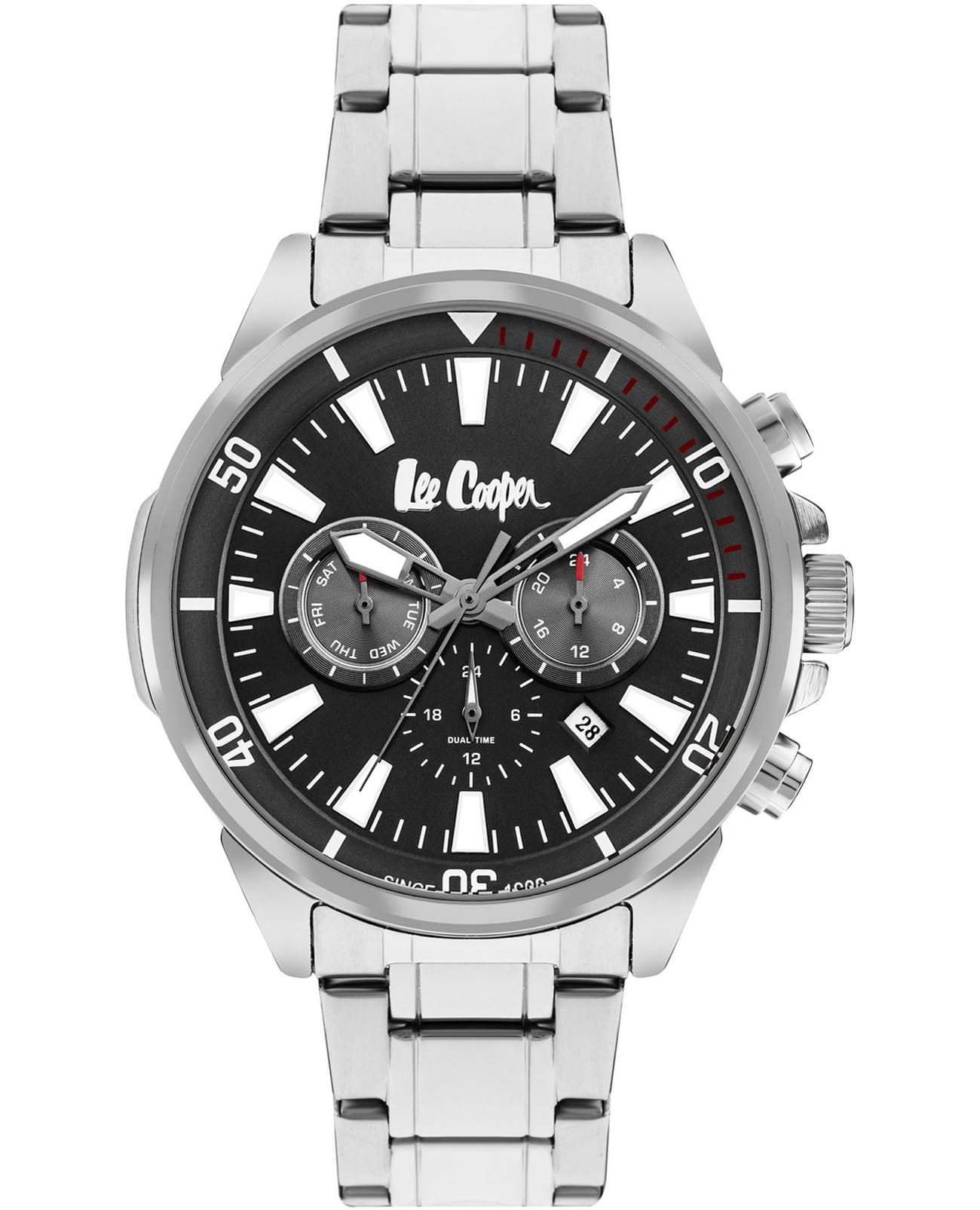 Мужские наручные часы Lee Cooper LC07846.350 оснащены кварцевым механизмом, обеспечивающий высокую точность хода и надежность. Элегантный корпус часов выполнен из суперметалла серебристого цвета, что делает их устойчивыми к внешним воздействиям и придает благородный вид. Циферблат украшен стрелками и метками с люминесцентным покрытиемЛюминесцентное покрытиеПозволяет считывать показания времени в темноте. Производители наносят на стрелки, часовые индексы, безель или поверхность циферблата светонакопительный состав, дающий холодное свечение., гармонично дополняющим общий дизайн модели. Для защиты циферблата используется минеральное стеклоМинеральное стеклоМинеральное стекло представляет собой искусственно выращенный минерал кварца. Такое стекло отличается особой устойчивостью к повреждениям и царапинам. Уступает по некоторым качествам сапфировому стеклу., устойчивое к царапинам и механическим повреждениям. Корпус имеет круглую форму диаметром 46 мм, что делает часы заметными и подходящими. Браслет из стали оснащен раскладной застёжкойРаскладная застёжкаТакой тип застёжки используется только на браслетах из металла. Она никогда не раскрывается полностью, происходит разделение на 2 и более частей. Раскладывающая застёжка снизит вероятность потери часов к минимуму., обеспечивающим комфортное и безопасное ношение. Вынесенный циферблат с 24-х часовым указателем времени, дня недели и вторым часовым поясомВторой часовой поясФункция, позволяющая отображать время двух часовых поясов одновременно.. Окошко даты находится в положении между 4 и 5 часов. Часы обладают водонепроницаемостью до 50 метров (5 АТМ), что позволяет использовать их в повседневной жизни, включая контакт с водой при мытье рук или дожде. Эти часы станут идеальным выбором для мужчин, ценящих стиль, качество и функциональность.