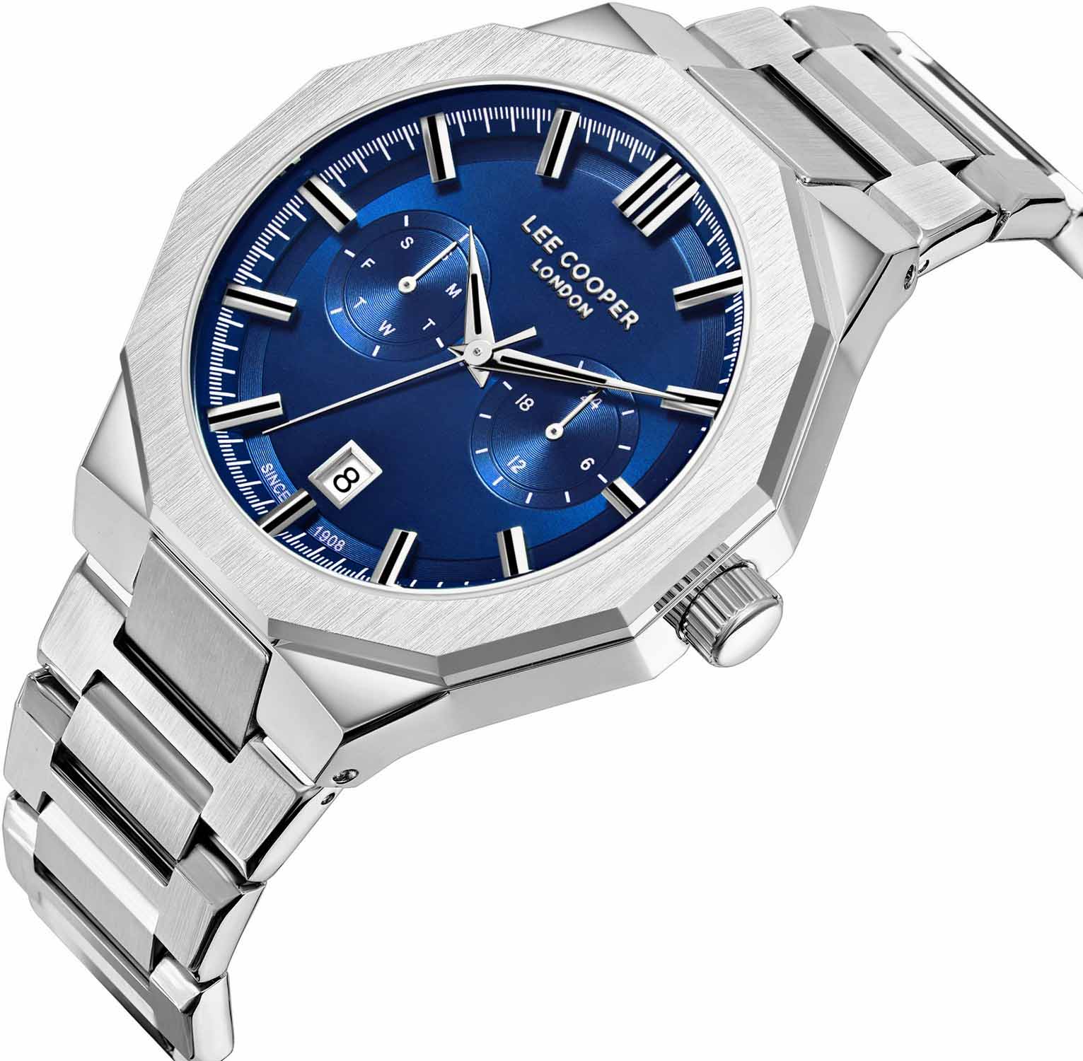 Мужские часы Lee Cooper LC08018.390 выполнены в классическом стиле и сочетают строгий дизайн с надёжным кварцевым механизмом. Корпус круглой формы имеет размер 44 мм, браслет — стальной, что делает модель заметной на руке и подчёркивает её брутальный акцент. Циферблат синего цвета дополнен индексами и функциями отображения даты, дня недели и мирового времениМировое время Полезное часовое усложнение, отображающее время в основных городах и известных областях по всему миру, оно связано с часовыми поясами, удобно для путешественников и бизнесменов. , расположенные в положении 3 часов — удобно для повседневного использования. Защиту циферблата обеспечивает прочное минеральное стеклоМинеральное стеклоМинеральное стекло представляет собой искусственно выращенный минерал кварца. Такое стекло отличается особой устойчивостью к повреждениям и царапинам. Уступает по некоторым качествам сапфировому стеклу., устойчивое к мелким царапинам и механическим повреждениям. Водозащита позволяет использовать часы в условиях случайного контакта с водой, например при мытье рук или во время дождя. Механизм отличается высокой точностью хода и минимальным обслуживанием. Это идеальный выбор для тех, кто ценит строгий стиль, качество и функциональность в одном аксессуаре.