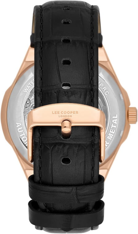 Мужские наручные часы Lee Cooper Мужские наручные часы Lee Cooper LC08050.451 — это стильная модель, сочетающая в себе современный дизайн и функциональность. Корпус часов выполнен из нержавеющей стали с IP-покрытиемIP-покрытиеМетод ионного напыления. Демонстрирует повышенную устойчивость к истиранию, окислению и химическим веществам. Под воздействием высокого давления и температуры около 1500°C молекулы металла надёжно соединяются с частицами корпуса часов., что делает их устойчивыми к внешним воздействиям и придает благородный вид. Часы оснащены автоподзаводом калибра G3265ZH, который заряжается от движения руки и обеспечивает высокую точность хода. Черный циферблат украшен скелетонизированным дизайном, позволяющим наблюдать за работой механизма, что делает часы не только функциональными, но и визуально привлекательными. Для защиты циферблата используется минеральное стеклоМинеральное стеклоМинеральное стекло представляет собой искусственно выращенный минерал кварца. Такое стекло отличается особой устойчивостью к повреждениям и царапинам. Уступает по некоторым качествам сапфировому стеклу., устойчивое к царапинам и механическим повреждениям. Корпус имеет круглую форму диаметром 43 мм, что делает часы заметными и подходящими для повседневного ношения. Ремешок из натуральной кожи с тиснением "под крокодила". Застежка стандартная классическая. Модель обладает водонепроницаемостью до 50 метров (5 АТМ), что позволяет использовать часы в повседневной жизни, включая контакт с водой при мытье рук или дожде. Эти часы станут идеальным выбором для мужчин, ценящих стиль, качество и функциональность.