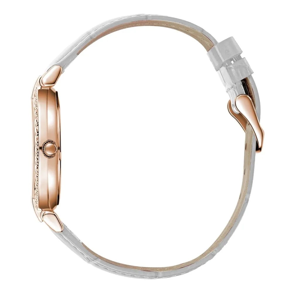 Женские кварцевые часы Lincor 4604L-5 с круглым корпусом из нержавеющей стали с PVD-покрытиемPVDУльтратонкое покрытие наносится в технике вакуумного напыления, сочетает в себе нитрид титана особой прочности со слоем золота или оксида хрома. Несёт в себе декоративную или защитную функцию. диаметром 36 мм. Циферблат оборудован метками и стрелками для лучшей индикации времени. Для защиты от царапин использовано минеральное стеклоМинеральное стеклоМинеральное стекло представляет собой искусственно выращенный минерал кварца. Такое стекло отличается особой устойчивостью к повреждениям и царапинам. Уступает по некоторым качествам сапфировому стеклу.. БезельБезельВнешний ободок, закрепляющий стекло. В спортивных часах так называется поворотное кольцо с делениями на циферблате, выполняет роль таймера – замеряет отрезки времени на шкале. Неподвижный безель – элемент декора. Однонаправленно вращающийся безель на дайверских часах позволяет фиксировать моменты погружения и выныривания на поверхность. декорирован кристаллами. Часы оснащены кожаным ремешком со стандартной застёжкой. Водозащита 30 м предназначена для защиты от брызг и дождя, купание не допускается.