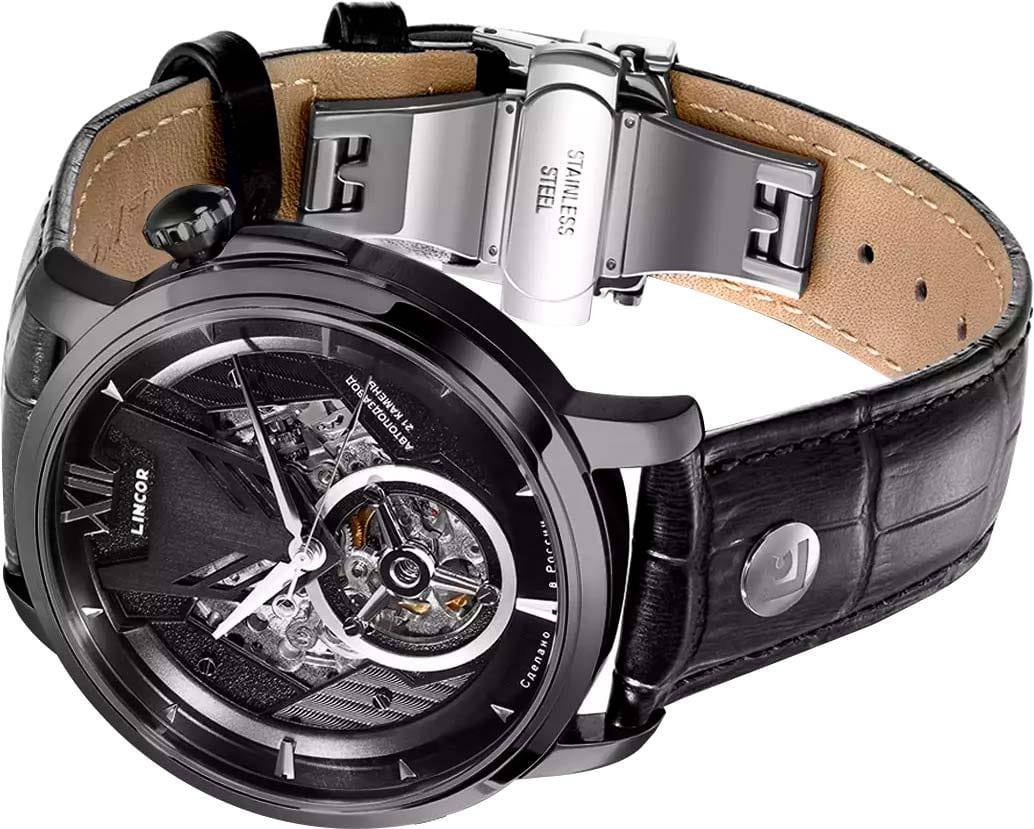 Lincor 7235MS11L1 — мужские механические часы с корпусом из нержавеющей стали с PVD-покрытиемPVDУльтратонкое покрытие наносится в технике вакуумного напыления, сочетает в себе нитрид титана особой прочности со слоем золота или оксида хрома. Несёт в себе декоративную или защитную функцию. диаметром 43 мм и кожаным ремешком на застёжке-бабочке с кнопкамиЗастёжка "бабочка"Такой вид застёжки дополняется предохранителями, помогающими избежать случайного раскрытия браслета. Обладают изящным исполнением. . Циферблат с акцентными стрелками и метками облегчает считывание времени. Сапфировое стеклоСапфировое стеклоПрочный и надёжный материал из кристалла сапфира синтетического происхождения, характеризующийся особой твёрдостью и устойчивостью к царапинам и повреждениям. защищает поверхность от царапин. Водозащита 50 м предотвращает попадание случайных брызг и дождевой воды, плавание не предусмотрено.