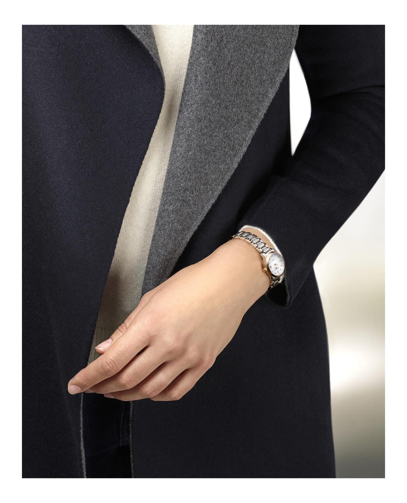 Перламутровый циферблат инкрустирован 12 бриллиантами общим весом в 0,034 карата. Швейцарский автоматический механизм L595 отличается запасом хода на 40 часов. Модель выполнена из стали 316L с частичным покрытием из 18-ти каратного жёлтого золота18-каратное золотоОбозначение по каратной системе пробирования, оно показывает, сколько драгоценного металла содержится в изделии. 18 карат - в составе 75% чистого золота, соответствует 750 пробе.