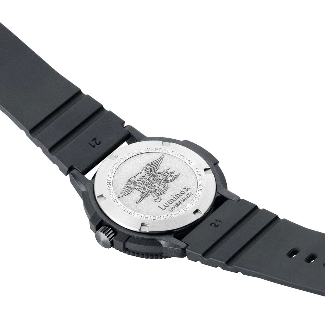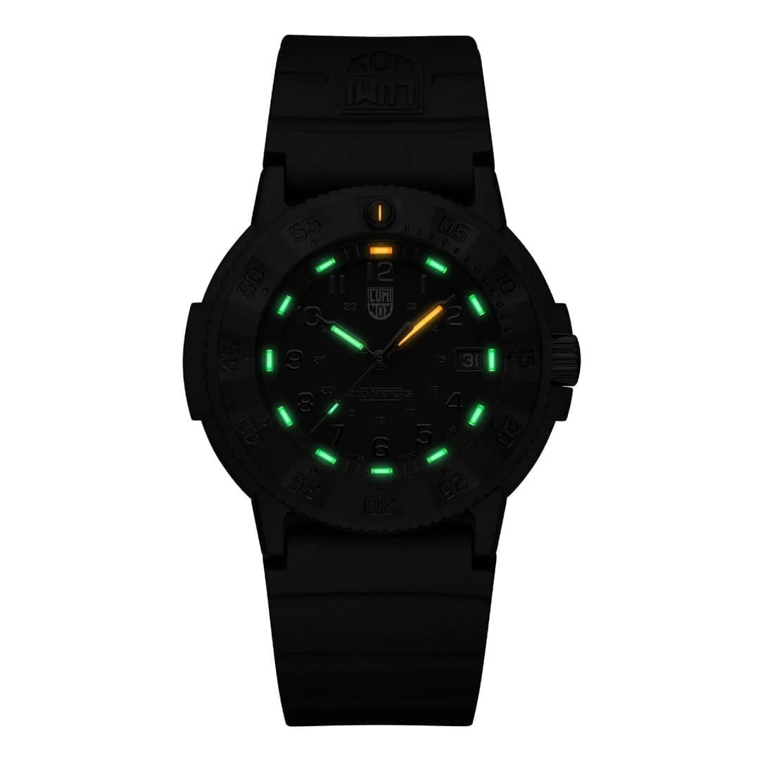 Часы Luminox XS.3001.EVO.BO.S — это надежные и стильные швейцарские часы с кварцевым механизмом. Корпус выполнен из CARBONOX™, усиленного прессованным карбономКарбонОт «carbon», «carbone» - углерод, углепластик - полимерный композиционный материал из переплетённых под определенным углом между собой нитей углеродного волокна, применяется для изготовления лёгких, но прочных деталей. В часах часто используют для украшения циферблатов и ремешков. Так же карбон используется в изготовлении корпусов. Такие корпуса обладают антикоррозионным свойством, не поддаются электромагнитному излучению, обладают повышенной прочностью и противоударностью., что обеспечивает прочность и долговечность. Черный циферблат защищен минеральным стекломМинеральное стеклоМинеральное стекло представляет собой искусственно выращенный минерал кварца. Такое стекло отличается особой устойчивостью к повреждениям и царапинам. Уступает по некоторым качествам сапфировому стеклу. повышенной прочности, что делает его устойчивым к царапинам и ударам. Нитриловый каучуковый браслет с классической застежкой обеспечивает комфортное ношение и надежность фиксации на запястье. Эти часы обладают впечатляющим уровнем водозащиты до 200 метров, что делает их подходящими для водных видов спорта и активного отдыха. Однонаправленный вращающийся безельБезельВнешний ободок, закрепляющий стекло. В спортивных часах так называется поворотное кольцо с делениями на циферблате, выполняет роль таймера – замеряет отрезки времени на шкале. Неподвижный безель – элемент декора. Однонаправленно вращающийся безель на дайверских часах позволяет фиксировать моменты погружения и выныривания на поверхность. добавляет функциональности и удобства. Технология LLTLLTLLT — это автономный механизм подсветки, основанный на использовании микроскопических газонаполненных элементов. Специальные герметичные капсулы из боросиликатного стекла, интегрированные в циферблат, генерируют свечение без необходимости подключения к внешним источникам энергии. Для их работы не требуется ни дополнительный свет, ни механическое воздействие (например, нажатие кнопки). Свечение возникает благодаря химическому процессу: реакция между тритием, заключенным в капсулах, и люминофорным покрытием создает стабильное автономное освещение. Технология обеспечивает энергетическую независимость и долговечность подсветки.-подсветки обеспечивает отличную видимость в темноте на протяжении 25 лет, позволяя контролировать время даже при полном отсутствии света. Заводная головка снабжена защитой и двойной уплотнительной прокладкой для обеспечения герметичности, а задняя крышка крепится на винтах для дополнительной надежности.