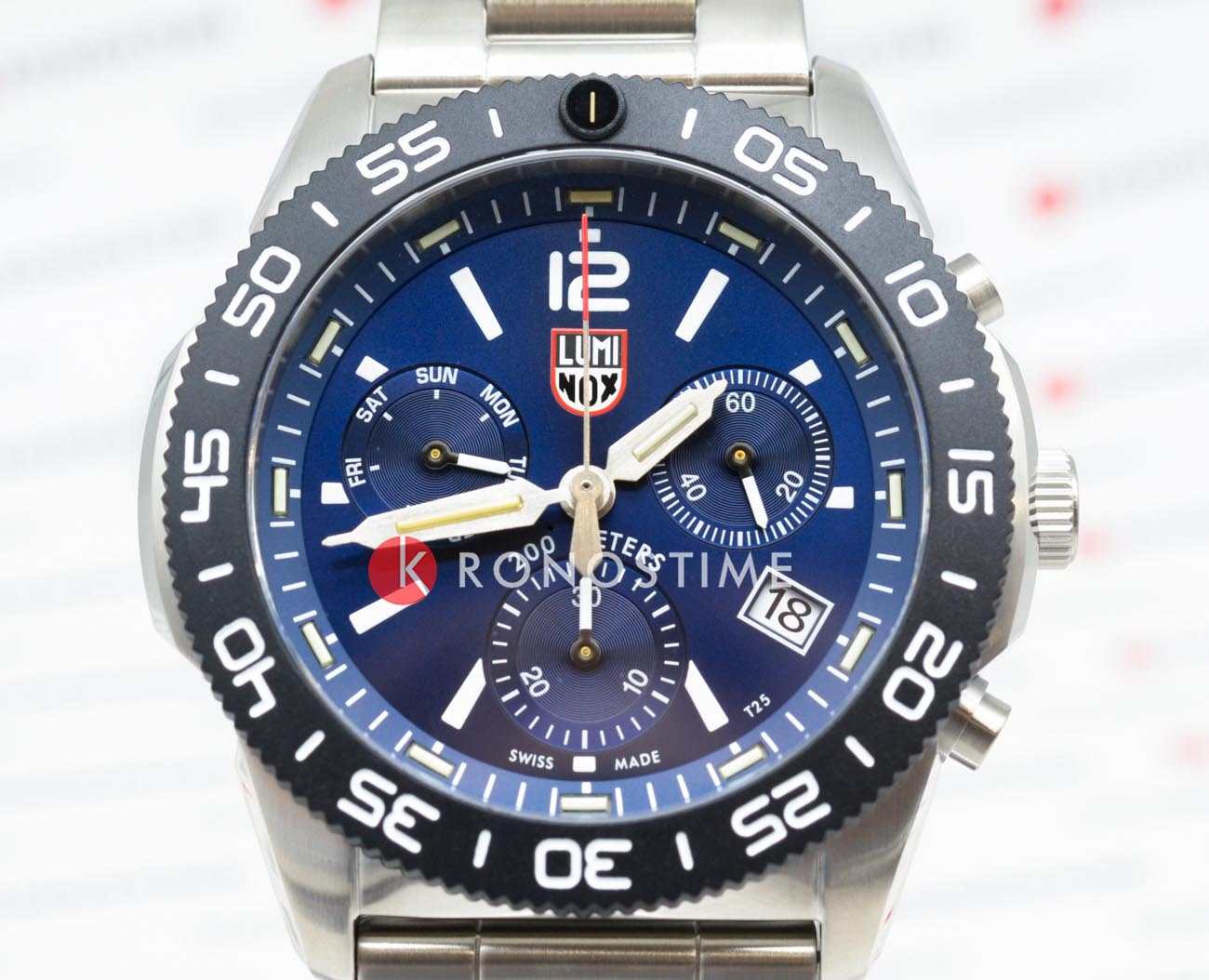 Мужские наручные часы-хронографХронографФункция позволяет измерять отрезки времени с особой точностью: часы, минуты, секунды. Верным признаком хронографа является наличие на циферблате 3 дополнительных окошек-счётчиков. Luminox XS.3144 из коллекции Pacific Diver сочетают в себе спортивный дизайн и надежность швейцарского качества . Модель обладает круглым корпусом диаметром 44 мм, изготовленным из нержавеющей стали с PVD-покрытиемPVDУльтратонкое покрытие наносится в технике вакуумного напыления, сочетает в себе нитрид титана особой прочности со слоем золота или оксида хрома. Несёт в себе декоративную или защитную функцию., что обеспечивает высокую устойчивость к внешним воздействиям и долговечность . Циферблат черного цвета украшен контрастными метками и стрелками с люминесцентным покрытиемЛюминесцентное покрытиеПозволяет считывать показания времени в темноте. Производители наносят на стрелки, часовые индексы, безель или поверхность циферблата светонакопительный состав, дающий холодное свечение., гарантирующим постоянную видимость времени даже в условиях низкой освещенности благодаря системе LLTLLTLLT — это автономный механизм подсветки, основанный на использовании микроскопических газонаполненных элементов. Специальные герметичные капсулы из боросиликатного стекла, интегрированные в циферблат, генерируют свечение без необходимости подключения к внешним источникам энергии. Для их работы не требуется ни дополнительный свет, ни механическое воздействие (например, нажатие кнопки). Свечение возникает благодаря химическому процессу: реакция между тритием, заключенным в капсулах, и люминофорным покрытием создает стабильное автономное освещение. Технология обеспечивает энергетическую независимость и долговечность подсветки. (микрогазовые огни) . Часы оснащены кварцевым механизмом швейцарского производства Ronda 515, обеспечивающим точность хода ±15 секунд в месяц . Защиту циферблата обеспечивает прочное сапфировое стеклоСапфировое стеклоПрочный и надёжный материал из кристалла сапфира синтетического происхождения, характеризующийся особой твёрдостью и устойчивостью к царапинам и повреждениям. с антибликовым покрытиемАнтибликовое покрытиеСлой оксида металла в 0,13-0,3 микрон, благодаря которому стекло часов не бликует и не отражает свет. Антибликовое покрытие уменьшает отражение света в 10 раз, обеспечивая отличную читаемость показателей циферблата., устойчивое к царапинам и механическим повреждениям . Водонепроницаемость модели достигает 20 атмосфер (200 метров), что делает их подходящими для плавания и активного отдыха на воде, включая дайвинг . Модель также оснащена безелемБезельВнешний ободок, закрепляющий стекло. В спортивных часах так называется поворотное кольцо с делениями на циферблате, выполняет роль таймера – замеряет отрезки времени на шкале. Неподвижный безель – элемент декора. Однонаправленно вращающийся безель на дайверских часах позволяет фиксировать моменты погружения и выныривания на поверхность. с односторонним вращением, что добавляет функциональности при использовании в водных условиях . Стальной браслет на раскладной застёжкеРаскладная застёжкаТакой тип застёжки используется только на браслетах из металла. Она никогда не раскрывается полностью, происходит разделение на 2 и более частей.