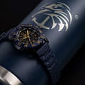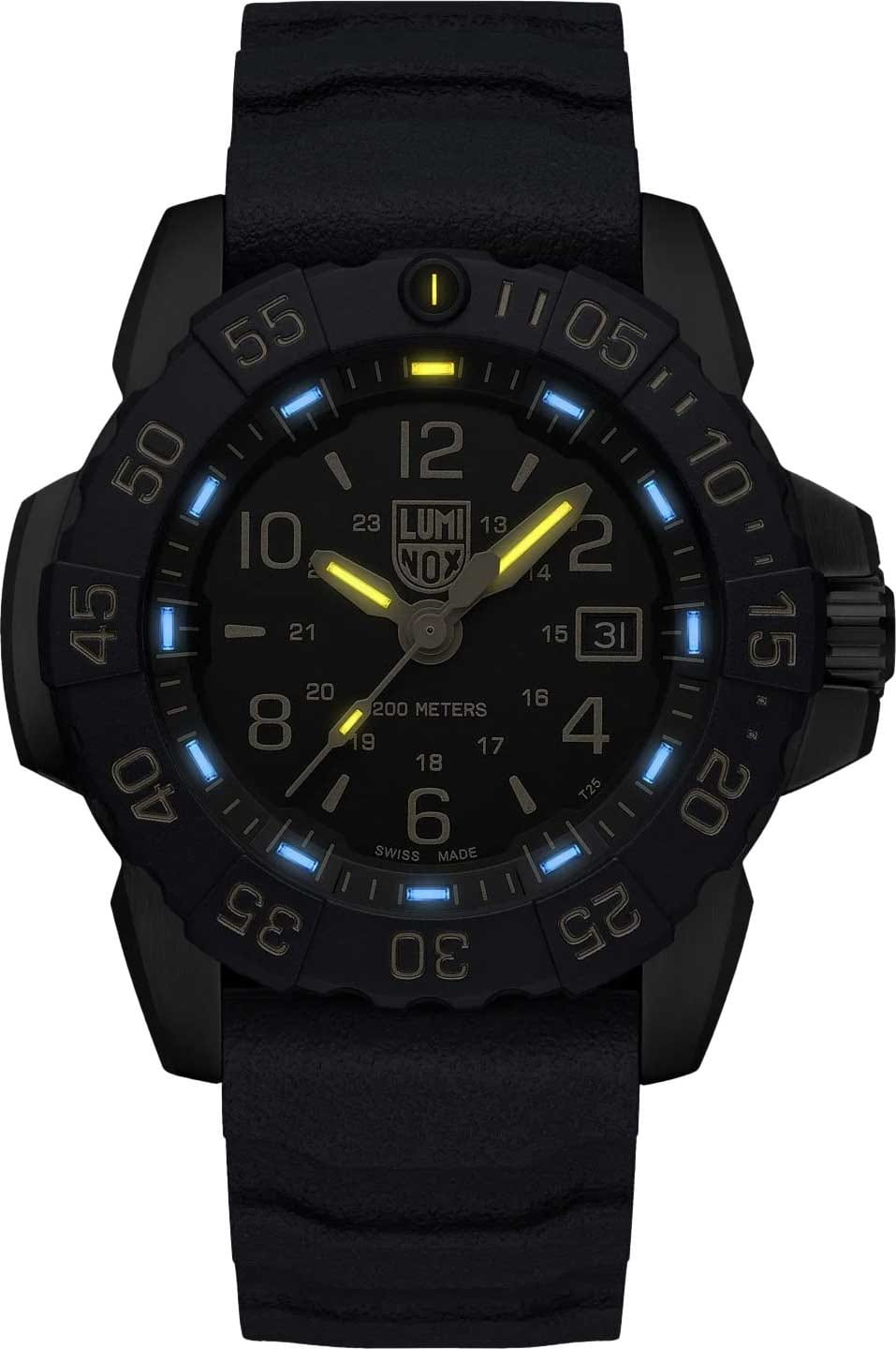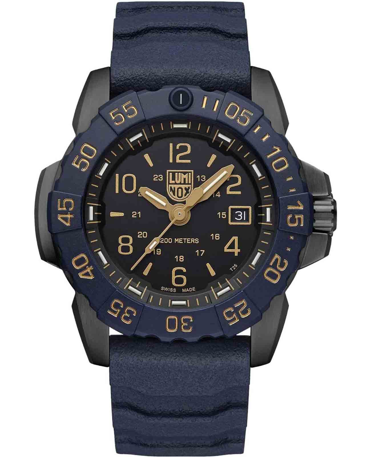 Luminox XS.3255.CB.NSF — это высококачественные швейцарские часы, созданные для тех, кто ценит надежность и стиль в повседневной жизни. Эти спортивные часы оборудованы кварцевым механизмом, который обеспечивает точность и стабильность работы. Их корпус выполнен из прочной стали 316L с PVD-покрытиемPVDУльтратонкое покрытие наносится в технике вакуумного напыления, сочетает в себе нитрид титана особой прочности со слоем золота или оксида хрома. Несёт в себе декоративную или защитную функцию. и карбоновой вставкой CARBONOX, что придаёт часам современный и технологичный вид. Черный циферблат, на котором нанесены метки в виде штрихов и арабских цифр, защищен сапфировым стекломСапфировое стеклоПрочный и надёжный материал из кристалла сапфира синтетического происхождения, характеризующийся особой твёрдостью и устойчивостью к царапинам и повреждениям. с антибликовым покрытиемАнтибликовое покрытиеСлой оксида металла в 0,13-0,3 микрон, благодаря которому стекло часов не бликует и не отражает свет. Антибликовое покрытие уменьшает отражение света в 10 раз, обеспечивая отличную читаемость показателей циферблата., что позволяет без труда считывать время даже при ярком солнечном свете. Технология LLTLLTLLT — это автономный механизм подсветки, основанный на использовании микроскопических газонаполненных элементов. Специальные герметичные капсулы из боросиликатного стекла, интегрированные в циферблат, генерируют свечение без необходимости подключения к внешним источникам энергии. Для их работы не требуется ни дополнительный свет, ни механическое воздействие (например, нажатие кнопки). Свечение возникает благодаря химическому процессу: реакция между тритием, заключенным в капсулах, и люминофорным покрытием создает стабильное автономное освещение. Технология обеспечивает энергетическую независимость и долговечность подсветки.-подсветки обеспечивает отличную видимость в темноте, сохраняя свою эффективность на протяжении 25 лет. Окошко даты удобно расположено в позиции 3 часов. Часы оснащены вращающимся в одном направлении безелемБезельВнешний ободок, закрепляющий стекло. В спортивных часах так называется поворотное кольцо с делениями на циферблате, выполняет роль таймера – замеряет отрезки времени на шкале. Неподвижный безель – элемент декора. Однонаправленно вращающийся безель на дайверских часах позволяет фиксировать моменты погружения и выныривания на поверхность. со светящейся меткой на 12 часов, что добавляет функциональности и удобства. Завинчивающаяся заводная головка с защитой и завинчивающаяся задняя крышка с гравировкой обеспечивают дополнительную герметичность и стильный внешний вид. Каучуковый синий ремешок с классической застежкой обеспечивает комфортное ношение и надежность фиксации на запястье. Эти часы обладают водозащитой до 200 метров, что делает их отличным выбором для активного отдыха и водных видов спорта.
