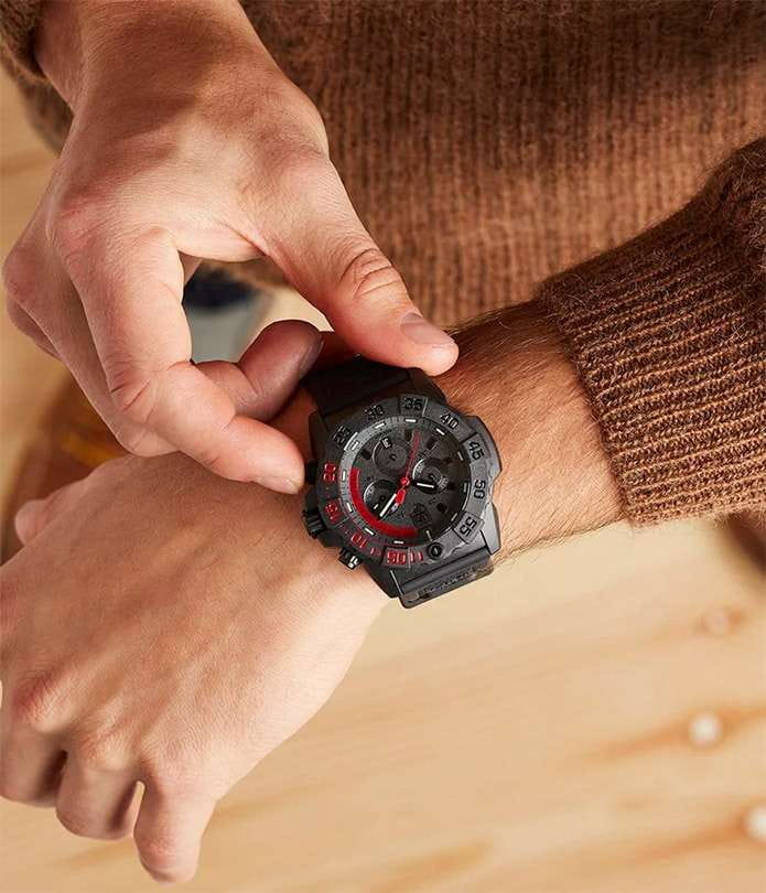 Часы Luminox XS.3581 представляют собой надежные и функциональные швейцарские часы, идеально подходящие для активных мужчин, стремящихся к новым достижениям. Они оснащены кварцевым механизмом с калибром Ronda 5030.D HH1 и выполнены в корпусе из пластика, усиленного прессованным карбоном, что делает их легкими и прочными. Черный циферблат часов защищен минеральным стекломМинеральное стеклоМинеральное стекло представляет собой искусственно выращенный минерал кварца. Такое стекло отличается особой устойчивостью к повреждениям и царапинам. Уступает по некоторым качествам сапфировому стеклу. повышенной прочности, способным выдерживать значительные нагрузки и сохраняя его в первозданном виде. Часы-хронографХронографФункция позволяет измерять отрезки времени с особой точностью: часы, минуты, секунды. Верным признаком хронографа является наличие на циферблате 3 дополнительных окошек-счётчиков. обладают функцией секундомераСекундомерСекундоме́р — прибор, способный измерять интервалы времени с точностью до долей секунды. и поддерживают 12- и 24-часовой формат времени, что делает их практичными в использовании. Карбоновый безельБезельВнешний ободок, закрепляющий стекло. В спортивных часах так называется поворотное кольцо с делениями на циферблате, выполняет роль таймера – замеряет отрезки времени на шкале. Неподвижный безель – элемент декора. Однонаправленно вращающийся безель на дайверских часах позволяет фиксировать моменты погружения и выныривания на поверхность., который вращается в одном направлении, снабжен светящейся меткой на 12 часов, обеспечивая удобство и точность в любых условиях. Технология LLTLLTLLT — это автономный механизм подсветки, основанный на использовании микроскопических газонаполненных элементов. Специальные герметичные капсулы из боросиликатного стекла, интегрированные в циферблат, генерируют свечение без необходимости подключения к внешним источникам энергии. Для их работы не требуется ни дополнительный свет, ни механическое воздействие (например, нажатие кнопки). Свечение возникает благодаря химическому процессу: реакция между тритием, заключенным в капсулах, и люминофорным покрытием создает стабильное автономное освещение. Технология обеспечивает энергетическую независимость и долговечность подсветки.-подсветки, использующая тритий, гарантирует превосходную видимость в полной темноте и будет служить надежным помощником в течение 25 лет. С водозащитой до 200 метров эти часы подходят для водных видов спорта и активных приключений. Завинчивающаяся задняя крышка и защищенная заводная головка обеспечивают дополнительную герметичность и долговечность часов. Резиновый браслет с классической стальной застежкой обеспечивает комфортное и надежное ношение, а календарь с указателем числа добавляет практичности.