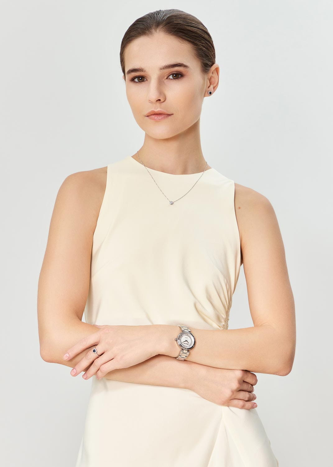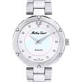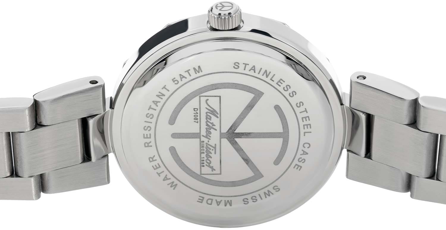 Женские кварцевые часы Mathey-Tissot Molly D1087AQI — это стильное сочетание элегантности и современного дизайна. Изящный корпус выполнен из нержавеющей стали серебристого цвета, диаметром 32 мм, что придаст образу элегантности и надежности. БезельБезельВнешний ободок, закрепляющий стекло. В спортивных часах так называется поворотное кольцо с делениями на циферблате, выполняет роль таймера – замеряет отрезки времени на шкале. Неподвижный безель – элемент декора. Однонаправленно вращающийся безель на дайверских часах позволяет фиксировать моменты погружения и выныривания на поверхность. и циферблат украшены кристаллами. Изысканный циферблат с метками в виде точек придает модели особый блеск. Циферблат защищен минеральным стекломМинеральное стеклоМинеральное стекло представляет собой искусственно выращенный минерал кварца. Такое стекло отличается особой устойчивостью к повреждениям и царапинам. Уступает по некоторым качествам сапфировому стеклу. с сапфировым покрытием, обеспечивает устойчивость к царапинам. Часы оснащены надежным кварцевым механизмом. Стальной браслет на застёжке-бабочке с кнопкамиЗастёжка "бабочка"Такой вид застёжки дополняется предохранителями, помогающими избежать случайного раскрытия браслета. Обладают изящным исполнением. , гарантирует комфортное и безопасное ношение. Класс водозащиты: 50 метров позволит защитить корпус от случайных брызг или капель дождя. Mathey-Tissot  — отличный выбор для тех, кто ценит утонченность и качество.