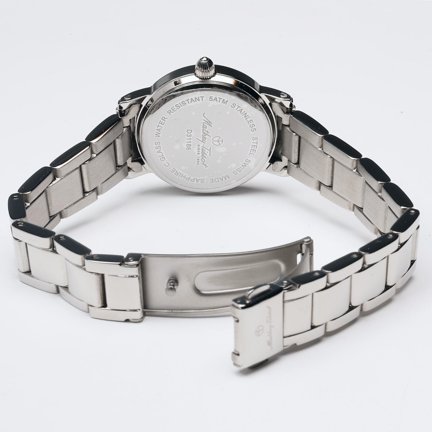 Женские кварцевые часы Mathey-Tissot City Metal D31186MABU — это стильное сочетание элегантности и современного дизайна. Изящный корпус выполнен из нержавеющей стали 316L, что придаст образу женственности и романтизма. Изысканный циферблат с метками в виде штрихов придает модели особый блеск. Циферблат защищен минеральным стекломМинеральное стеклоМинеральное стекло представляет собой искусственно выращенный минерал кварца. Такое стекло отличается особой устойчивостью к повреждениям и царапинам. Уступает по некоторым качествам сапфировому стеклу. с сапфировым покрытием, обеспечивает устойчивость к царапинам. Окошко даты находится в положении 3 часов. Часы оснащены надежным кварцевым механизмом. Стальной браслет на раскладной застёжкеРаскладная застёжкаТакой тип застёжки используется только на браслетах из металла. Она никогда не раскрывается полностью, происходит разделение на 2 и более частей. Раскладывающая застёжка снизит вероятность потери часов к минимуму., гарантирует комфортное и безопасное ношение. Класс водозащиты: 30 метров позволит защитить корпус от случайных брызг или капель дождя. Mathey-Tissot  — отличный выбор для тех, кто ценит утонченность и качество.