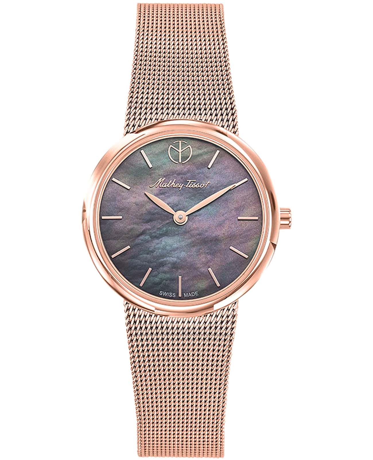 Женские кварцевые часы Mathey-Tissot Milly D403PN — это стильное сочетание элегантности и современного дизайна. Изящный корпус выполнен из нержавеющей стали с PVD-покрытиемPVDУльтратонкое покрытие наносится в технике вакуумного напыления, сочетает в себе нитрид титана особой прочности со слоем золота или оксида хрома. Несёт в себе декоративную или защитную функцию. цвета розового золота, диаметром 30 мм, что придаст образу элегантности и надежности. Изысканный перламутровый циферблат с метками в виде штрихов придает модели особый блеск. Циферблат защищен минеральным стекломМинеральное стеклоМинеральное стекло представляет собой искусственно выращенный минерал кварца. Такое стекло отличается особой устойчивостью к повреждениям и царапинам. Уступает по некоторым качествам сапфировому стеклу. с сапфировым покрытием, обеспечивает устойчивость к царапинам. Часы оснащены надежным кварцевым механизмом. Стальной браслет с PVD-покрытиемPVDУльтратонкое покрытие наносится в технике вакуумного напыления, сочетает в себе нитрид титана особой прочности со слоем золота или оксида хрома. Несёт в себе декоративную или защитную функцию. миланского плетения на раскладном замкеРаскладная застёжкаТакой тип застёжки используется только на браслетах из металла. Она никогда не раскрывается полностью, происходит разделение на 2 и более частей. Раскладывающая застёжка снизит вероятность потери часов к минимуму., гарантирует комфортное и безопасное ношение. Класс водозащиты: 30 метров позволит защитить корпус от случайных брызг или капель дождя. Mathey-Tissot — отличный выбор для тех, кто ценит утонченность и качество.