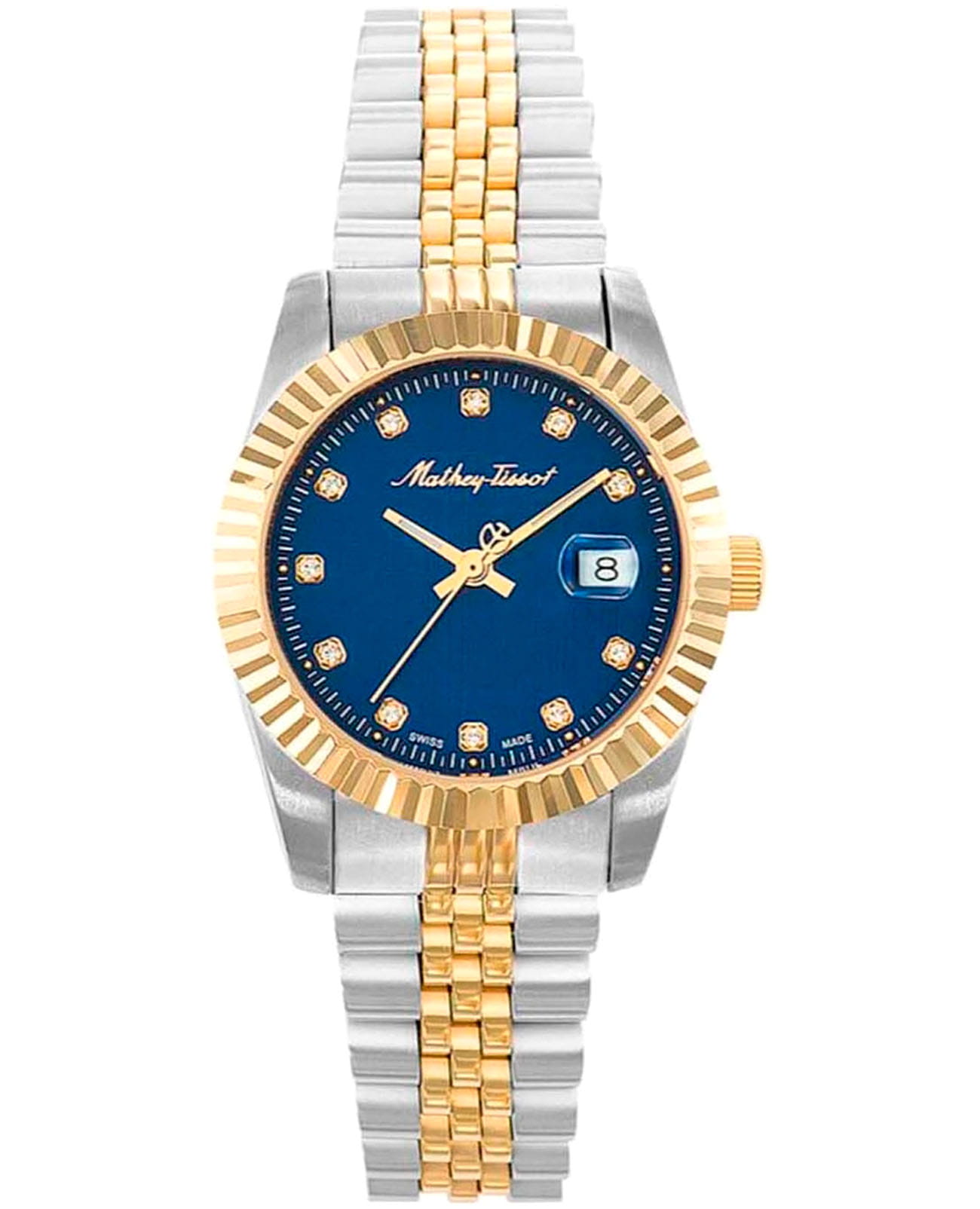 Женские кварцевые часы Mathey-Tissot Mathy D810BBU — это стильное сочетание элегантности и современного дизайна. Изящный корпус выполнен из нержавеющей стали, диаметром 32 мм, что придаст образу женственности и романтизма. Изысканный циферблат с метками в виде точек украшены кристаллами, что придает модели особый блеск. Циферблат защищен минеральным стекломМинеральное стеклоМинеральное стекло представляет собой искусственно выращенный минерал кварца. Такое стекло отличается особой устойчивостью к повреждениям и царапинам. Уступает по некоторым качествам сапфировому стеклу., обеспечивающий устойчивость к царапинам. Стрелки с люминесцентным покрытиемЛюминесцентное покрытиеПозволяет считывать показания времени в темноте. Производители наносят на стрелки, часовые индексы, безель или поверхность циферблата светонакопительный состав, дающий холодное свечение.. БезельБезельВнешний ободок, закрепляющий стекло. В спортивных часах так называется поворотное кольцо с делениями на циферблате, выполняет роль таймера – замеряет отрезки времени на шкале. Неподвижный безель – элемент декора. Однонаправленно вращающийся безель на дайверских часах позволяет фиксировать моменты погружения и выныривания на поверхность. с PVD-покрытиемPVDУльтратонкое покрытие наносится в технике вакуумного напыления, сочетает в себе нитрид титана особой прочности со слоем золота или оксида хрома. Несёт в себе декоративную или защитную функцию. золотистого цвета. Окошко даты находится в положении 3 часа. Часы оснащены надежным кварцевым механизмом. Стальной браслет с частичным PVD-покрытиемPVDУльтратонкое покрытие наносится в технике вакуумного напыления, сочетает в себе нитрид титана особой прочности со слоем золота или оксида хрома. Несёт в себе декоративную или защитную функцию. на раскладной застёжке с фиксаторомРаскладная застёжкаТакой тип застёжки используется только на браслетах из металла. Она никогда не раскрывается полностью, происходит разделение на 2 и более частей. Раскладывающая застёжка снизит вероятность потери часов к минимуму., гарантирует комфортное и безопасное ношение. Класс водозащиты: 50 метров позволит защитить корпус от случайных брызг или капель дождя. Mathey-Tissot  — отличный выбор для тех, кто ценит утонченность и качество.