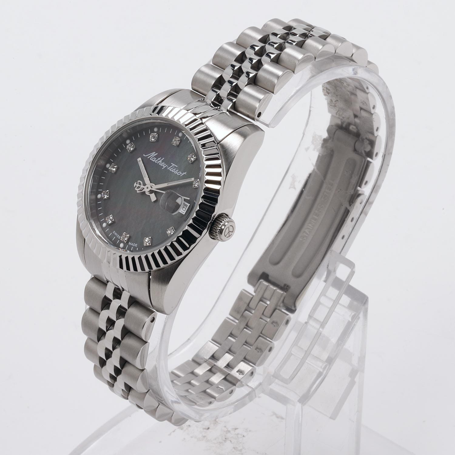 Женские кварцевые часы Mathey-Tissot Mathy D910AN — это стильное сочетание элегантности и современного дизайна. Изящный корпус выполнен из нержавеющей стали, диаметром 32 мм, что придаст образу женственности и романтизма. Изысканный циферблат с метками в виде точек украшены цирконами, что придает модели особый блеск. Циферблат защищен минеральным стекломМинеральное стеклоМинеральное стекло представляет собой искусственно выращенный минерал кварца. Такое стекло отличается особой устойчивостью к повреждениям и царапинам. Уступает по некоторым качествам сапфировому стеклу., обеспечивающий устойчивость к царапинам. Стрелки с люминесцентным покрытиемЛюминесцентное покрытиеПозволяет считывать показания времени в темноте. Производители наносят на стрелки, часовые индексы, безель или поверхность циферблата светонакопительный состав, дающий холодное свечение.. Окошко даты находится в положении 3 часа. Часы оснащены надежным кварцевым механизмом. Стальной браслет на раскладной застёжкеРаскладная застёжкаТакой тип застёжки используется только на браслетах из металла. Она никогда не раскрывается полностью, происходит разделение на 2 и более частей. Раскладывающая застёжка снизит вероятность потери часов к минимуму., гарантирует комфортное и безопасное ношение. Класс водозащиты: 50 метров позволит защитить корпус от случайных брызг или капель дождя. Mathey-Tissot  — отличный выбор для тех, кто ценит утонченность и качество.