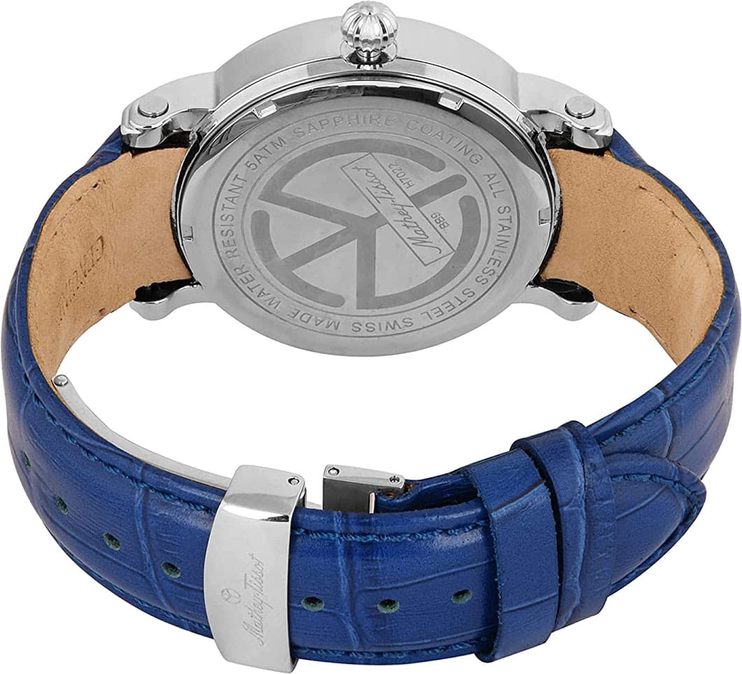 Mathey-Tissot Retrograde H7022ABU — практичные часы с ярким дизайном и ретроградным указателем дня недели станут отличным вариантом на каждый день. Изящный корпус выполнен из нержавеющей стали, диаметром 43 мм, что придаст образу элегантности и надежности. Изысканный циферблат с метками в виде штрихов придает модели особый блеск. Циферблат защищен минеральным стекломМинеральное стеклоМинеральное стекло представляет собой искусственно выращенный минерал кварца. Такое стекло отличается особой устойчивостью к повреждениям и царапинам. Уступает по некоторым качествам сапфировому стеклу., обеспечивает устойчивость к царапинам. Стрелки с люминесцентным покрытиемЛюминесцентное покрытиеПозволяет считывать показания времени в темноте. Производители наносят на стрелки, часовые индексы, безель или поверхность циферблата светонакопительный состав, дающий холодное свечение.. Окошко даты находится в положении 6 часов. Часы оснащены надежным кварцевым механизмом. Кожаный ремешок на раскладной застёжкеРаскладная застёжкаТакой тип застёжки используется только на браслетах из металла. Она никогда не раскрывается полностью, происходит разделение на 2 и более частей. Раскладывающая застёжка снизит вероятность потери часов к минимуму. гарантирует комфортное и безопасное ношение. Класс водозащиты: 50 метров позволит защитить корпус от случайных брызг или капель дождя. Mathey-Tissot — отличный выбор для тех, кто ценит утонченность и качество.