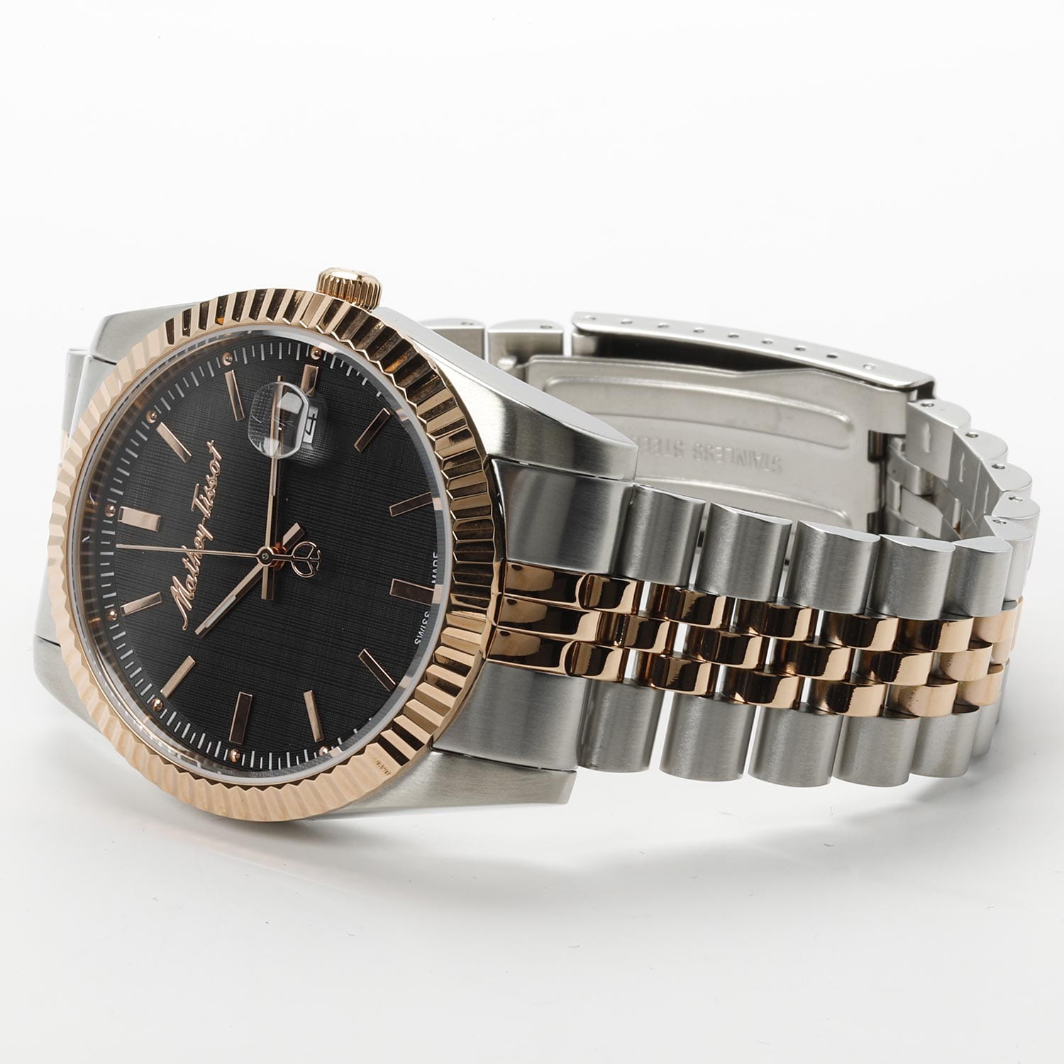 Мужские кварцевые часы Mathey-Tissot Mathy H810RN — это стильное сочетание элегантности и современного дизайна. Изящный корпус выполнен из нержавеющей стали, диаметром 40 мм, что придаст образу элегантности и надежности. Изысканный циферблат с метками в виде штрихов придает модели особый блеск. Циферблат защищен минеральным стекломМинеральное стеклоМинеральное стекло представляет собой искусственно выращенный минерал кварца. Такое стекло отличается особой устойчивостью к повреждениям и царапинам. Уступает по некоторым качествам сапфировому стеклу., обеспечивает устойчивость к царапинам. Стрелки с люминесцентным покрытиемЛюминесцентное покрытиеПозволяет считывать показания времени в темноте. Производители наносят на стрелки, часовые индексы, безель или поверхность циферблата светонакопительный состав, дающий холодное свечение., которое светится в темноте после непродолжительной зарядки на свету. БезельБезельВнешний ободок, закрепляющий стекло. В спортивных часах так называется поворотное кольцо с делениями на циферблате, выполняет роль таймера – замеряет отрезки времени на шкале. Неподвижный безель – элемент декора. Однонаправленно вращающийся безель на дайверских часах позволяет фиксировать моменты погружения и выныривания на поверхность. с PVD-покрытиемPVDУльтратонкое покрытие наносится в технике вакуумного напыления, сочетает в себе нитрид титана особой прочности со слоем золота или оксида хрома. Несёт в себе декоративную или защитную функцию. цвета розового золота. Окошко даты находится в положении 3 часа. Часы оснащены надежным кварцевым механизмом. Стальной браслет с частичным PVD-покрытиемPVDУльтратонкое покрытие наносится в технике вакуумного напыления, сочетает в себе нитрид титана особой прочности со слоем золота или оксида хрома. Несёт в себе декоративную или защитную функцию. на раскладной застёжке с фиксаторомРаскладная застёжкаТакой тип застёжки используется только на браслетах из металла. Она никогда не раскрывается полностью, происходит разделение на 2 и более частей. Раскладывающая застёжка снизит вероятность потери часов к минимуму., гарантирует комфортное и безопасное ношение. Рифленая заводная головка. Класс водозащиты: 50 метров позволит защитить корпус от случайных брызг или капель дождя. Mathey-Tissot  — отличный выбор для тех, кто ценит утонченность и качество.