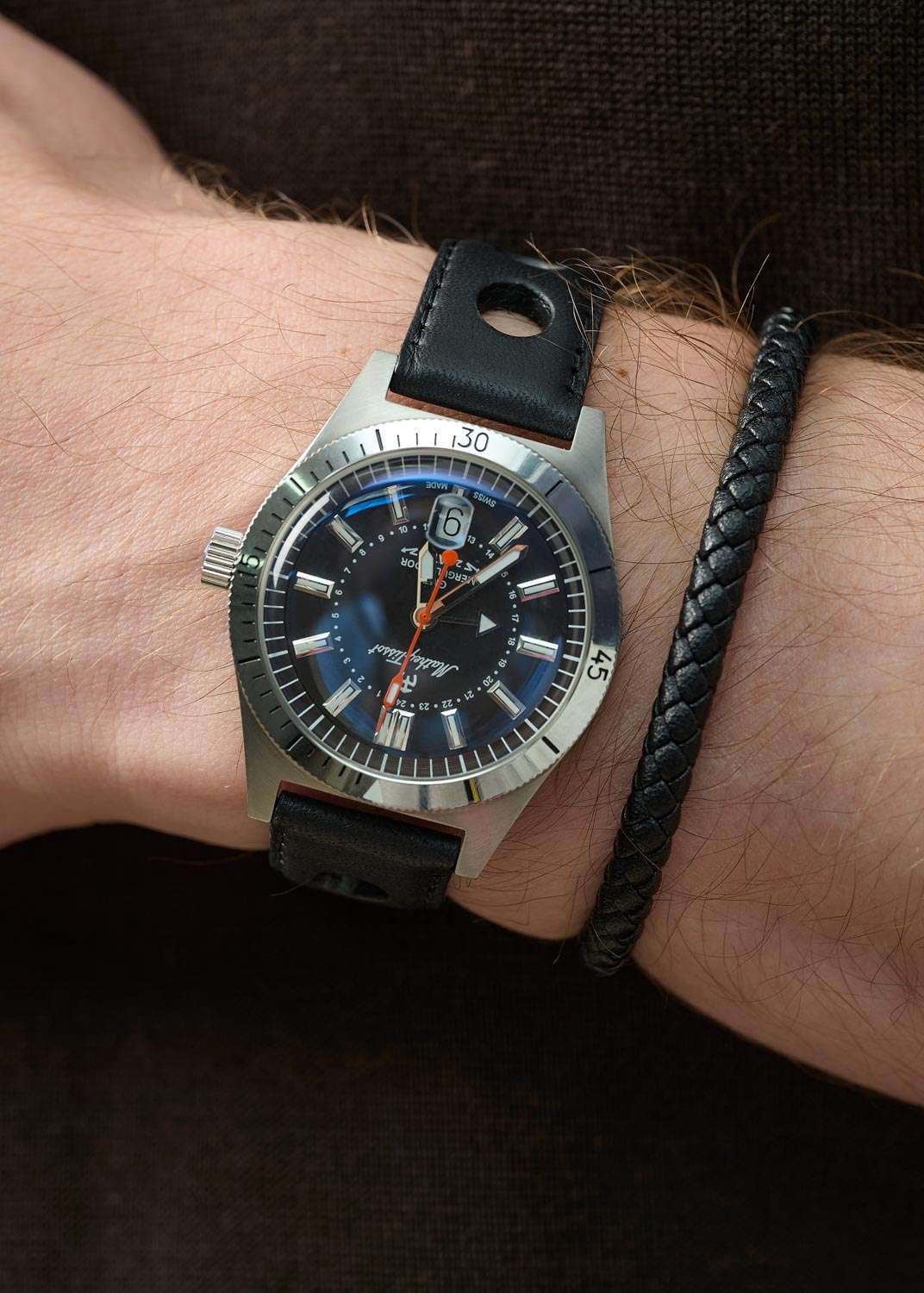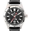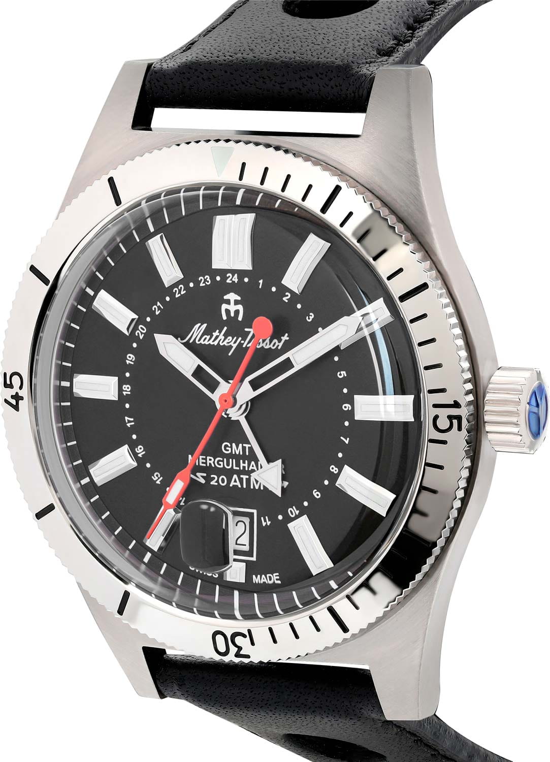 Мужские кварцевые часы Mathey-Tissot Mergulhador GMTGMTОтображение времени второго часового пояса.Такая функция особенно актуальна для путешественников и бизнесменов,которые общаются с людьми из разных стран,теперь вы всегда будете знать,какой час у вашего партнёра или близкого человека. MRGAN — это стильное сочетание элегантности и современного дизайна. Изящный корпус выполнен из нержавеющей стали, диаметром 41 мм, что придаст образу элегантности и надежности. Циферблат с метками в виде штрихов придает модели особый блеск. Циферблат защищен минеральным стекломМинеральное стеклоМинеральное стекло представляет собой искусственно выращенный минерал кварца. Такое стекло отличается особой устойчивостью к повреждениям и царапинам. Уступает по некоторым качествам сапфировому стеклу. с сапфировым покрытием, обеспечивает устойчивость к царапинам. Второй часовой поясВторой часовой поясФункция, позволяющая отображать время двух часовых поясов одновременно. в 24-х часовом формате времени отображается центральной стрелкой. Стрелки и метки с люминесцентным покрытиемЛюминесцентное покрытиеПозволяет считывать показания времени в темноте. Производители наносят на стрелки, часовые индексы, безель или поверхность циферблата светонакопительный состав, дающий холодное свечение. SuperLumiNova, которое светится в темноте после непродолжительной зарядки на свету. Окошко даты находится в положении 6 часов.  Рифленый безельБезельВнешний ободок, закрепляющий стекло. В спортивных часах так называется поворотное кольцо с делениями на циферблате, выполняет роль таймера – замеряет отрезки времени на шкале. Неподвижный безель – элемент декора. Однонаправленно вращающийся безель на дайверских часах позволяет фиксировать моменты погружения и выныривания на поверхность. с минутными отметками вращается в одном направлении. Часы оснащены надежным кварцевым механизмом. Кожаный ремешок на стандартной застёжке гарантирует комфортное и безопасное ношение. Класс водозащиты: 200 метров позволит плавать, нырять и заниматься другими водными видами спорта. Mathey-Tissot  — отличный выбор для тех, кто ценит утонченность и качество.