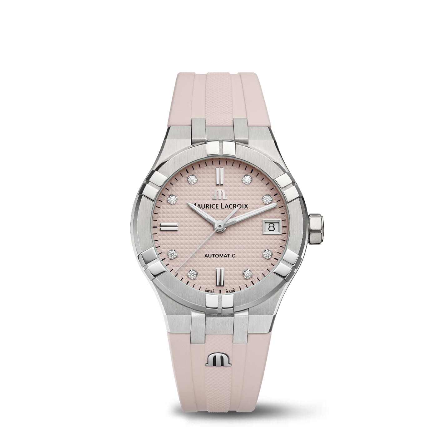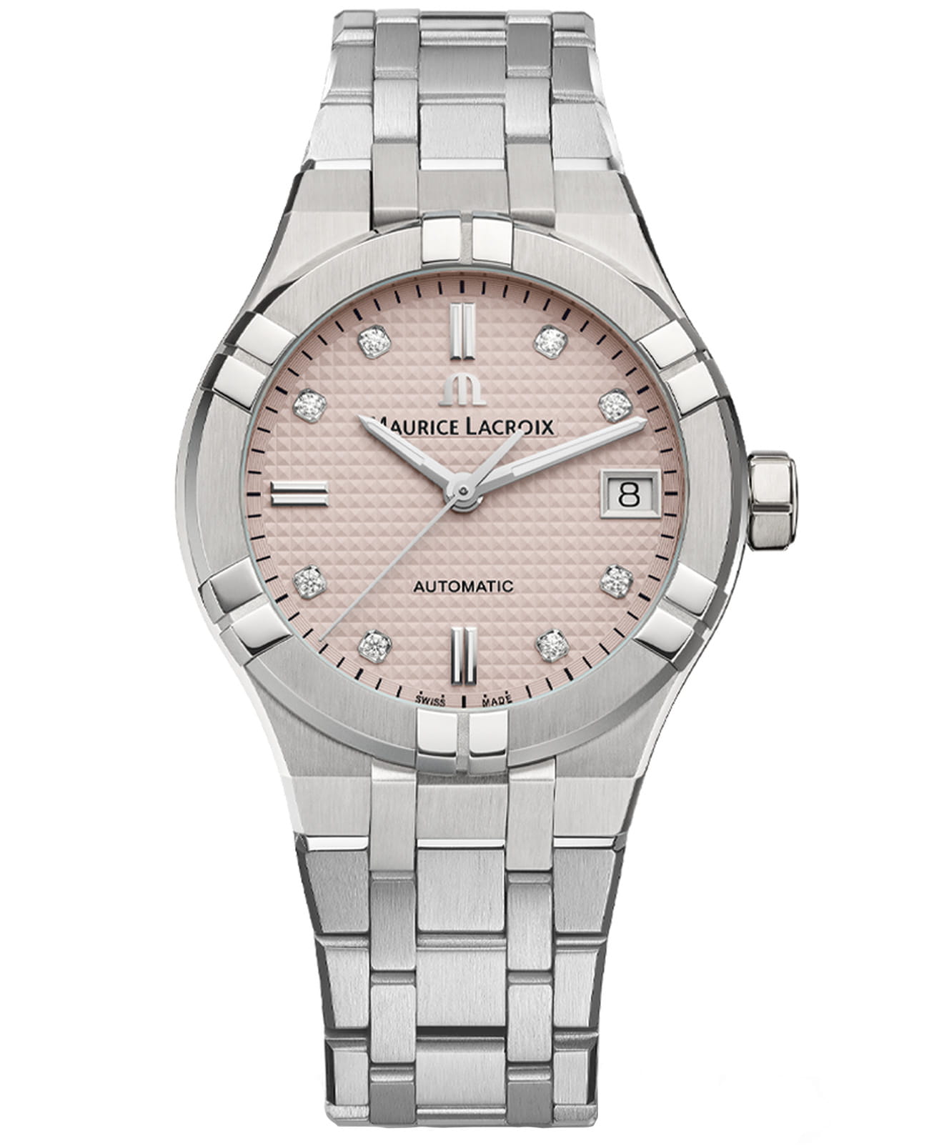 Женские швейцарские механические часы с автоподзаводом Maurice Lacroix Aikon Automatic Limited Summer Edition 35 mm AI6006-SS00F-550-E, автоматический механизм с высокой точностью. Сапфировое стеклоСапфировое стеклоПрочный и надёжный материал из кристалла сапфира синтетического происхождения, характеризующийся особой твёрдостью и устойчивостью к царапинам и повреждениям. устойчивое к появлению царапин, обладающее высокой прозрачностью. Корпус часов изготовлен из нержавеющей стали. Стрелки и метки с люминесцентным покрытиемЛюминесцентное покрытиеПозволяет считывать показания времени в темноте. Производители наносят на стрелки, часовые индексы, безель или поверхность циферблата светонакопительный состав, дающий холодное свечение.. Водозащита: 200 метров, позволит плавать, нырять и заниматься другими водными видами спорта. Стальной браслет на застёжке-бабочке с кнопкамиЗастёжка "бабочка"Такой вид застёжки дополняется предохранителями, помогающими избежать случайного раскрытия браслета. Обладают изящным исполнением. .