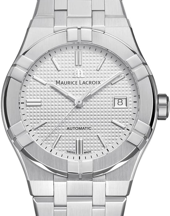 Maurice Lacroix AIKON Automatic Date AI6007-SS002-130-1 — элегантные швейцарские часы, сочетающие современный дизайн и высококачественные материалы. Корпус выполнен из нержавеющей стали диаметром 39 мм, создавая современный и универсальный облик. Сапфировое стеклоСапфировое стеклоПрочный и надёжный материал из кристалла сапфира синтетического происхождения, характеризующийся особой твёрдостью и устойчивостью к царапинам и повреждениям. с антибликовым покрытиемАнтибликовое покрытиеСлой оксида металла в 0,13-0,3 микрон, благодаря которому стекло часов не бликует и не отражает свет. Антибликовое покрытие уменьшает отражение света в 10 раз, обеспечивая отличную читаемость показателей циферблата. защищает циферблат и обеспечивает отличную читаемость. Серебристый циферблат с узором "Clous de Paris" придаёт модели глубину и изысканность. Браслет из нержавеющей стали на застёжке-бабочке с кнопкамиЗастёжка "бабочка"Такой вид застёжки дополняется предохранителями, помогающими избежать случайного раскрытия браслета. Обладают изящным исполнением. гарантирует комфорт и надёжность при ношении. Функциональность дополняется индикацией даты в положении "3 часа" и центральными стрелками для часов, минут и секунд. Водонепроницаемость 200 метров делает модель подходящей для плавания и сноркелинга.