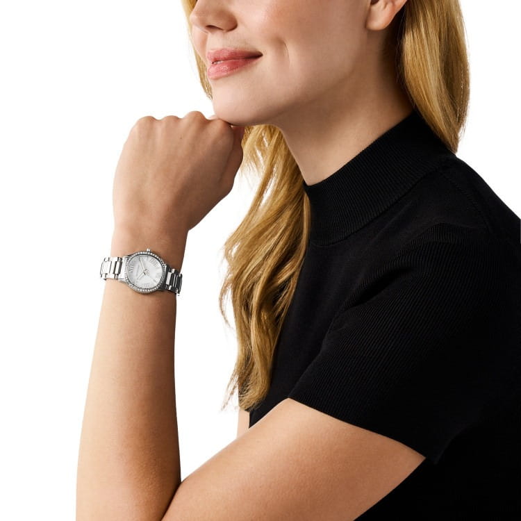 Эти часы — идеальный аксессуар, который придаст женскому образу завершенность и особый шарм. Женские американские часы Michael Kors Sage MK4824 имеют кварцевый механизм с высокой точностью. Корпус и браслет часов изготовлены из нержавеющей стали. Перламутровый циферблат и безельБезельВнешний ободок, закрепляющий стекло. В спортивных часах так называется поворотное кольцо с делениями на циферблате, выполняет роль таймера – замеряет отрезки времени на шкале. Неподвижный безель – элемент декора. Однонаправленно вращающийся безель на дайверских часах позволяет фиксировать моменты погружения и выныривания на поверхность. украшены кристаллами. Циферблат с метками в виде римских цифр и штрихов защищен минеральным стекломМинеральное стеклоМинеральное стекло представляет собой искусственно выращенный минерал кварца. Такое стекло отличается особой устойчивостью к повреждениям и царапинам. Уступает по некоторым качествам сапфировому стеклу., что обеспечивает надежную защиту от царапин и повреждений. Люминесцентное покрытиеЛюминесцентное покрытиеПозволяет считывать показания времени в темноте. Производители наносят на стрелки, часовые индексы, безель или поверхность циферблата светонакопительный состав, дающий холодное свечение. на стрелках обеспечивает отличную видимость в темноте. Класс водозащиты: 50 метров, позволит защитить корпус от случайных брызг или капель дождя. Стальной браслет на раскладной застёжкеРаскладная застёжкаТакой тип застёжки используется только на браслетах из металла. Она никогда не раскрывается полностью, происходит разделение на 2 и более частей. Раскладывающая застёжка снизит вероятность потери часов к минимуму. обеспечивает надежную фиксацию на запястье и легкость в надевании и снятии. Эти часы станут отличным дополнением к любому наряду, подчеркивая индивидуальность и стиль их обладательницы.