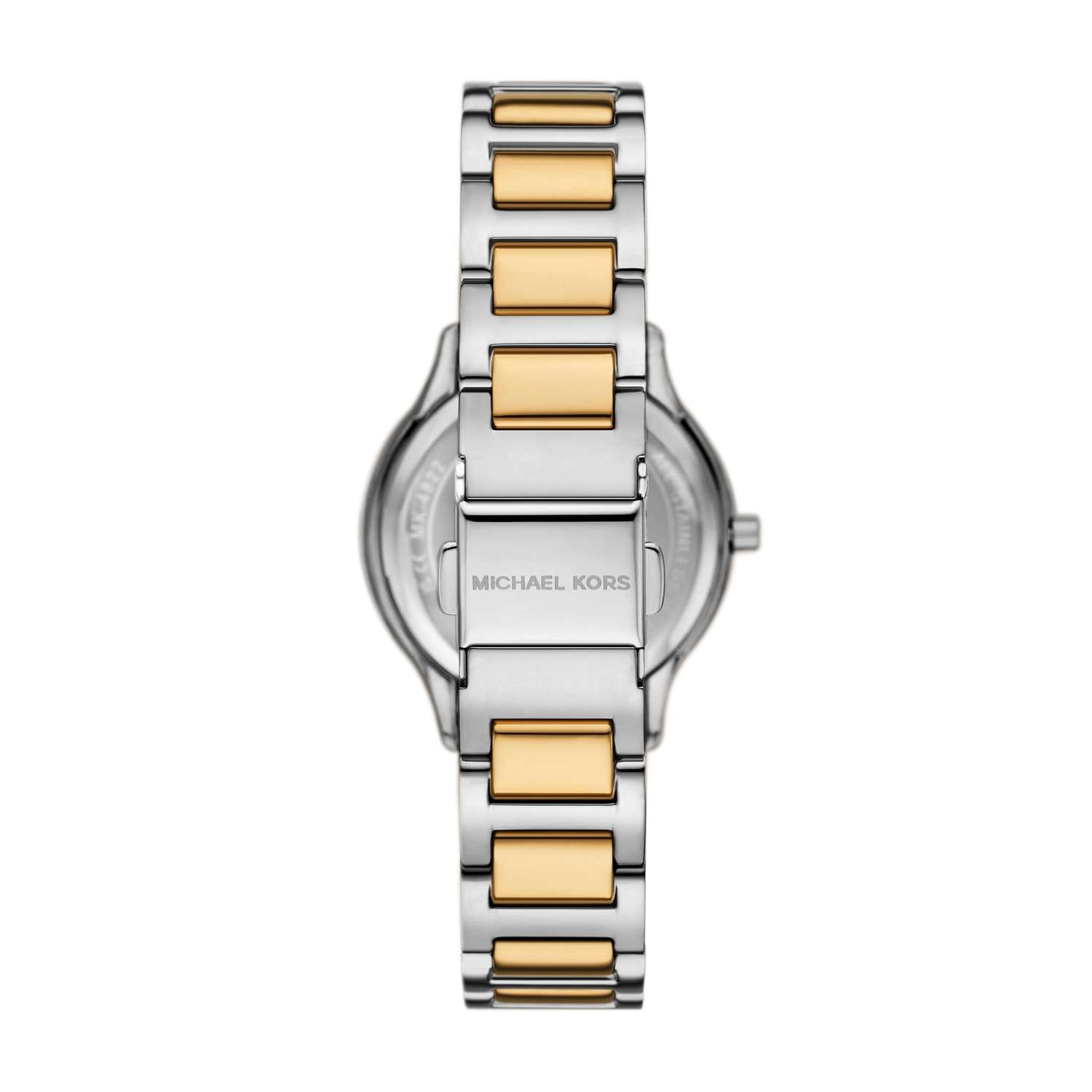 Женские американские часы Michael Kors SAGE MK4910 имеют кварцевый механизм с высокой точностью. Корпус часов изготовлен из нержавеющей стали серебристого цвета, диаметром 31 мм. Циферблат с метками в виде римских цифр защищен минеральным стекломМинеральное стеклоМинеральное стекло представляет собой искусственно выращенный минерал кварца. Такое стекло отличается особой устойчивостью к повреждениям и царапинам. Уступает по некоторым качествам сапфировому стеклу., что обеспечивает надежную защиту от царапин и повреждений. Неподвижный безельБезельВнешний ободок, закрепляющий стекло. В спортивных часах так называется поворотное кольцо с делениями на циферблате, выполняет роль таймера – замеряет отрезки времени на шкале. Неподвижный безель – элемент декора. Однонаправленно вращающийся безель на дайверских часах позволяет фиксировать моменты погружения и выныривания на поверхность. с PVD-покрытиемPVDУльтратонкое покрытие наносится в технике вакуумного напыления, сочетает в себе нитрид титана особой прочности со слоем золота или оксида хрома. Несёт в себе декоративную или защитную функцию. украшен кристаллами. Класс водозащиты: 50 метров позволит защитить корпус от случайных брызг или капель дождя. Стрелки с люминесцентным покрытиемЛюминесцентное покрытиеПозволяет считывать показания времени в темноте. Производители наносят на стрелки, часовые индексы, безель или поверхность циферблата светонакопительный состав, дающий холодное свечение.. Стальной браслет с частичным PVD-покрытиемPVDУльтратонкое покрытие наносится в технике вакуумного напыления, сочетает в себе нитрид титана особой прочности со слоем золота или оксида хрома. Несёт в себе декоративную или защитную функцию. на раскладной застёжкеРаскладная застёжкаТакой тип застёжки используется только на браслетах из металла. Она никогда не раскрывается полностью, происходит разделение на 2 и более частей. Раскладывающая застёжка снизит вероятность потери часов к минимуму. обеспечивает надежную фиксацию на запястье и легкость в надевании и снятии. Эти часы станут отличным дополнением к любому наряду, подчеркивая индивидуальность и стиль их обладательницы. Идеальный аксессуар, который придаст женскому образу завершенность и особый шарм.