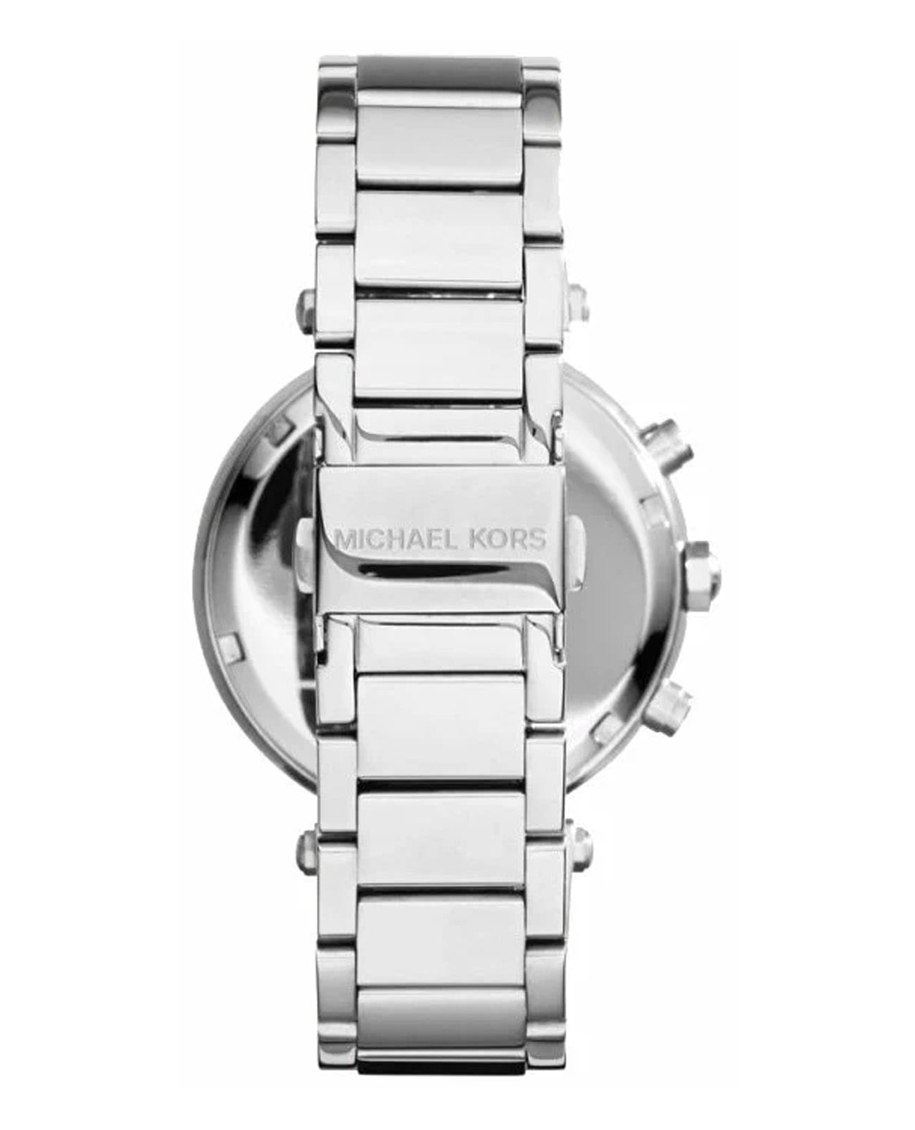 Женские американские часы- хронографХронографФункция позволяет измерять отрезки времени с особой точностью: часы, минуты, секунды. Верным признаком хронографа является наличие на циферблате 3 дополнительных окошек-счётчиков. Michael Kors Parker MK6104, кварцевый механизм с высокой точностью. Минеральное стеклоМинеральное стеклоМинеральное стекло представляет собой искусственно выращенный минерал кварца. Такое стекло отличается особой устойчивостью к повреждениям и царапинам. Уступает по некоторым качествам сапфировому стеклу., устойчивое к мелким механическим повреждениям. Корпус часов выполнен из нержавеющей стали. БезельБезельВнешний ободок, закрепляющий стекло. В спортивных часах так называется поворотное кольцо с делениями на циферблате, выполняет роль таймера – замеряет отрезки времени на шкале. Неподвижный безель – элемент декора. Однонаправленно вращающийся безель на дайверских часах позволяет фиксировать моменты погружения и выныривания на поверхность. и циферблат украшены кристаллами. Стрелки с люминесцентным покрытиемЛюминесцентное покрытиеПозволяет считывать показания времени в темноте. Производители наносят на стрелки, часовые индексы, безель или поверхность циферблата светонакопительный состав, дающий холодное свечение.. Окошко даты находится в положении между 4 и 5 часами. Класс водозащиты: 50 метров, позволит защитить корпус от случайных брызг или капель дождя. Стальной браслет на раскладной застёжкеРаскладная застёжкаТакой тип застёжки используется только на браслетах из металла. Она никогда не раскрывается полностью, происходит разделение на 2 и более частей. Раскладывающая застёжка снизит вероятность потери часов к минимуму..