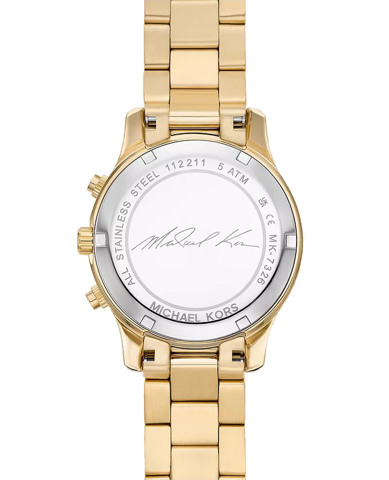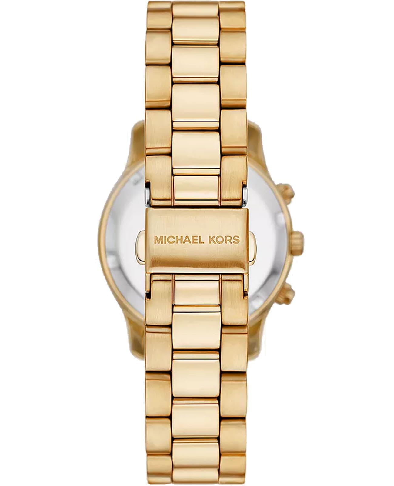 Женские американские часы-хронографХронографФункция позволяет измерять отрезки времени с особой точностью: часы, минуты, секунды. Верным признаком хронографа является наличие на циферблате 3 дополнительных окошек-счётчиков. с секундомеромСекундомерСекундоме́р — прибор, способный измерять интервалы времени с точностью до долей секунды. и с минеральным стекломМинеральное стеклоМинеральное стекло представляет собой искусственно выращенный минерал кварца. Такое стекло отличается особой устойчивостью к повреждениям и царапинам. Уступает по некоторым качествам сапфировому стеклу. Michael Kors Runway MK7326, кварцевый механизм с высокой точностью. Корпус часов изготовлен из нержавеющей стали с PVD-покрытиемPVDУльтратонкое покрытие наносится в технике вакуумного напыления, сочетает в себе нитрид титана особой прочности со слоем золота или оксида хрома. Несёт в себе декоративную или защитную функцию.. Три дополнительных индикатора на циферблате. Метки в виде штрихов и цифр. Стрелки и метки с люминесцентным покрытиемЛюминесцентное покрытиеПозволяет считывать показания времени в темноте. Производители наносят на стрелки, часовые индексы, безель или поверхность циферблата светонакопительный состав, дающий холодное свечение.. Окошко даты находится между 4 и 5 часами. Класс водозащиты: 50 метров, позволит защитить корпус от случайных брызг или капель дождя. Стальной браслет с PVD-покрытиемPVDУльтратонкое покрытие наносится в технике вакуумного напыления, сочетает в себе нитрид титана особой прочности со слоем золота или оксида хрома. Несёт в себе декоративную или защитную функцию. на раскладной застёжкеРаскладная застёжкаТакой тип застёжки используется только на браслетах из металла. Она никогда не раскрывается полностью, происходит разделение на 2 и более частей. Раскладывающая застёжка снизит вероятность потери часов к минимуму..