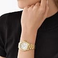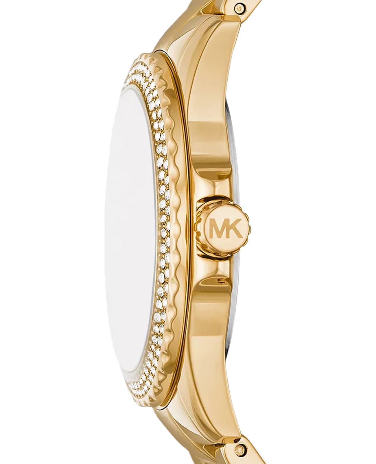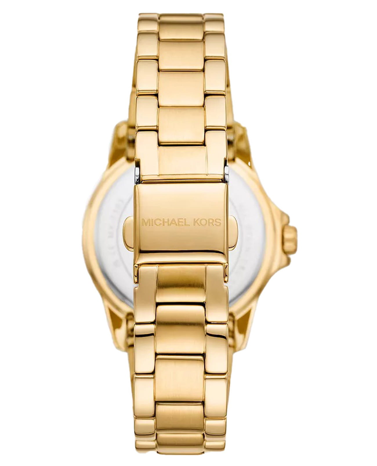 Женские американские часы с секундомеромСекундомерСекундоме́р — прибор, способный измерять интервалы времени с точностью до долей секунды. и с минеральным стекломМинеральное стеклоМинеральное стекло представляет собой искусственно выращенный минерал кварца. Такое стекло отличается особой устойчивостью к повреждениям и царапинам. Уступает по некоторым качествам сапфировому стеклу. Michael Kors Everest MK7363, кварцевый механизм с высокой точностью. Корпус часов изготовлен из нержавеющей стали с PVD-покрытиемPVDУльтратонкое покрытие наносится в технике вакуумного напыления, сочетает в себе нитрид титана особой прочности со слоем золота или оксида хрома. Несёт в себе декоративную или защитную функцию.. БезельБезельВнешний ободок, закрепляющий стекло. В спортивных часах так называется поворотное кольцо с делениями на циферблате, выполняет роль таймера – замеряет отрезки времени на шкале. Неподвижный безель – элемент декора. Однонаправленно вращающийся безель на дайверских часах позволяет фиксировать моменты погружения и выныривания на поверхность. и циферблат украшены кристаллами. Метки в виде штрихов и римских цифр. Секундная стрелка вынесена на малый циферблат. Метки с люминесцентным покрытиемЛюминесцентное покрытиеПозволяет считывать показания времени в темноте. Производители наносят на стрелки, часовые индексы, безель или поверхность циферблата светонакопительный состав, дающий холодное свечение.. Заводная головка с защитой. Класс водозащиты: 50 метров, позволит защитить корпус от случайных брызг или капель дождя. Стальной браслет с PVD-покрытиемPVDУльтратонкое покрытие наносится в технике вакуумного напыления, сочетает в себе нитрид титана особой прочности со слоем золота или оксида хрома. Несёт в себе декоративную или защитную функцию. на раскладной застёжкеРаскладная застёжкаТакой тип застёжки используется только на браслетах из металла. Она никогда не раскрывается полностью, происходит разделение на 2 и более частей. Раскладывающая застёжка снизит вероятность потери часов к минимуму..
