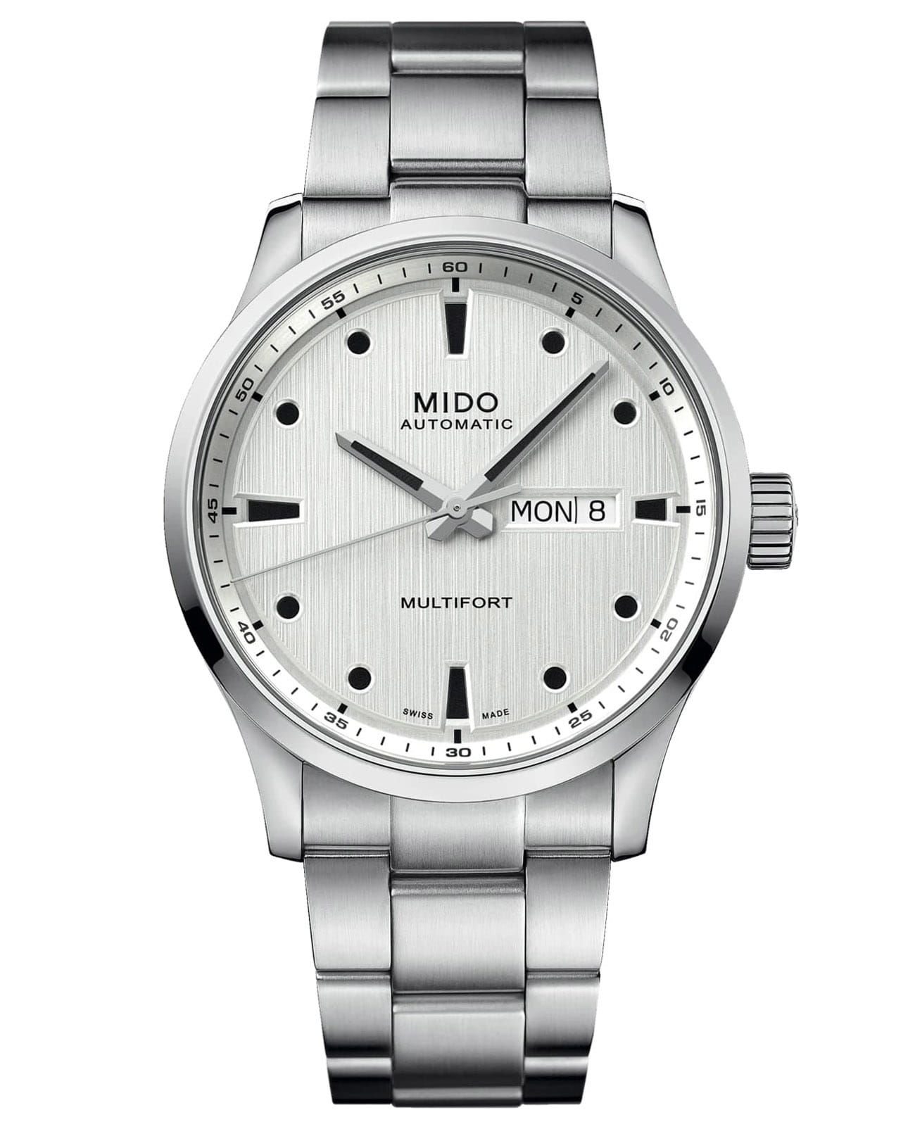 Вертикальная атласная отделка градиентного циферблата Multifort M напоминает о характерных чертах коллекции Côtes de Genève. Безупречное люминесцентное покрытиеЛюминесцентное покрытиеПозволяет считывать показания времени в темноте. Производители наносят на стрелки, часовые индексы, безель или поверхность циферблата светонакопительный состав, дающий холодное свечение. Super-LumiNova® создает контраст и читаемость на стрелках и круглых указателях. Легендарная надежность Multifort соответствует ритму знаменитого калибра 80. Запас хода до 80 часов обеспечивается Nivachron™Nivachron™Специально разработанный инновационный сплав Nivachron™ повышает устойчивость часов к воздействию магнитных полей. – революционного материала, обеспечивающего потрясающую точность. Mido предлагает Multifort M с системой смены ремня без инструментов, в стальном или текстильном исполнении на резиновой основе.
