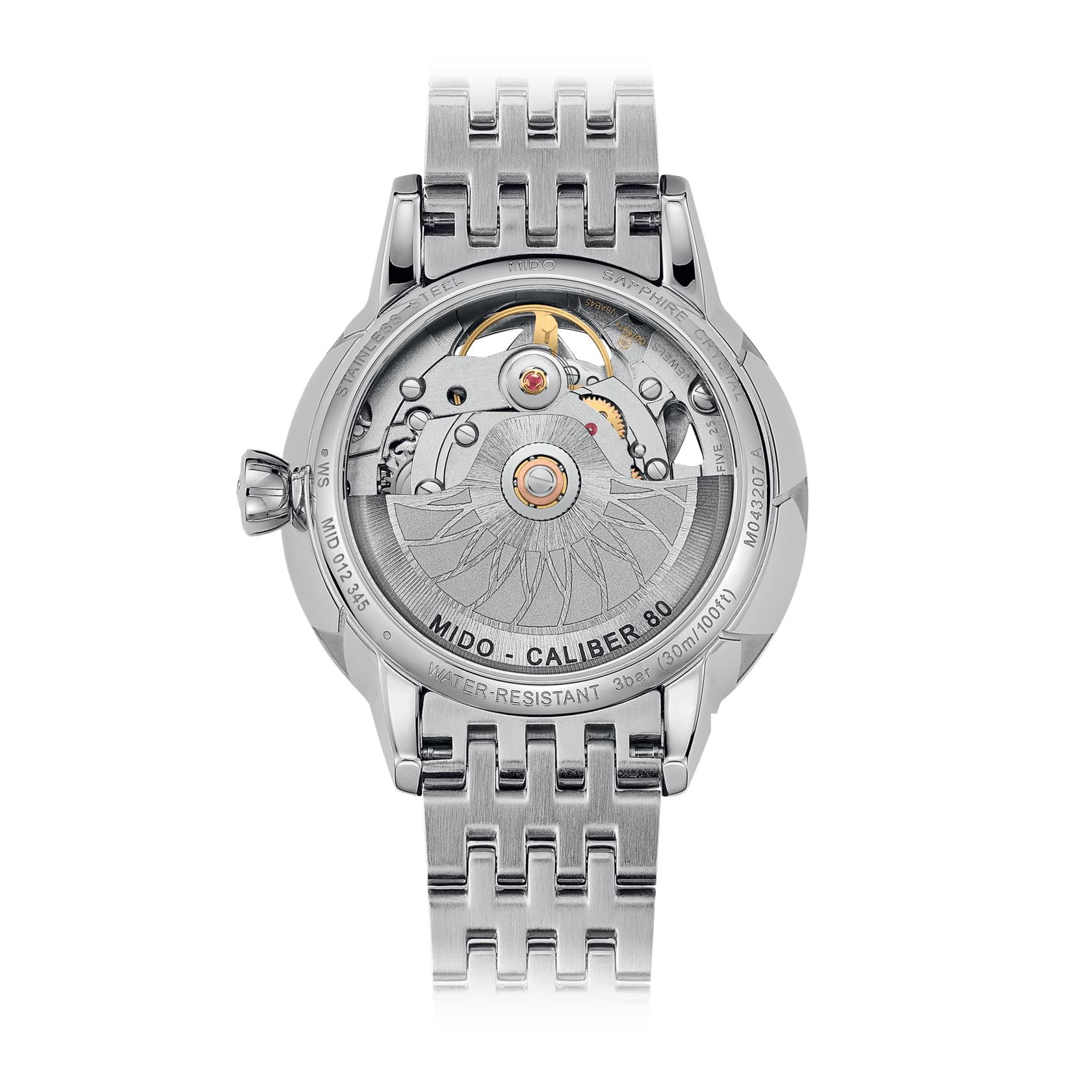 Модель оснащена автоматическим механизмом MIDO Caliber 80, обеспечивающим запас хода до 80 часов.