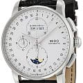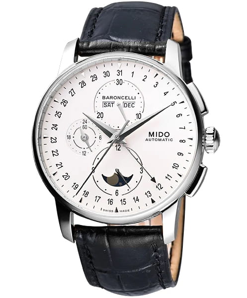 Швейцарские мужские наручные часы Mido Baroncelli 8607.4.M1.42, механический механизм (автоматический калибр) с высокой точностью. Сапфировое стеклоСапфировое стеклоПрочный и надёжный материал из кристалла сапфира синтетического происхождения, характеризующийся особой твёрдостью и устойчивостью к царапинам и повреждениям. устойчивое к появлению царапин, обладающее высокой прозрачностью. Класс водозащиты: 50 метров, позволит защитить корпус от случайных брызг или капель дождя. Корпус часов изготовлен из стали, серебристого цвета. В модели есть хронографХронографФункция позволяет измерять отрезки времени с особой точностью: часы, минуты, секунды. Верным признаком хронографа является наличие на циферблате 3 дополнительных окошек-счётчиков., 12-часовой счетчик расположен на 6 часов, 30-минутный на 12 часов и малая секунда на 9 часов. Центральная стрелка-указатель даты, апертура месяца и дня недели лаконично расположена на 12 часов, индикатор фазы луны.