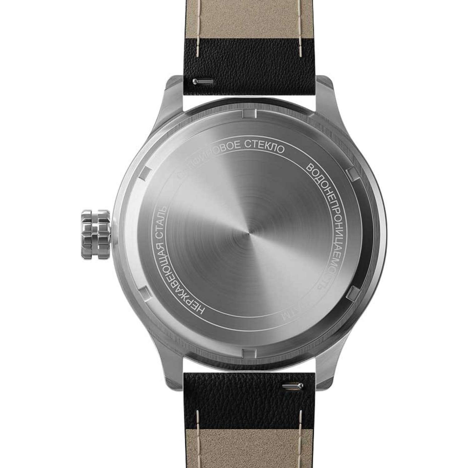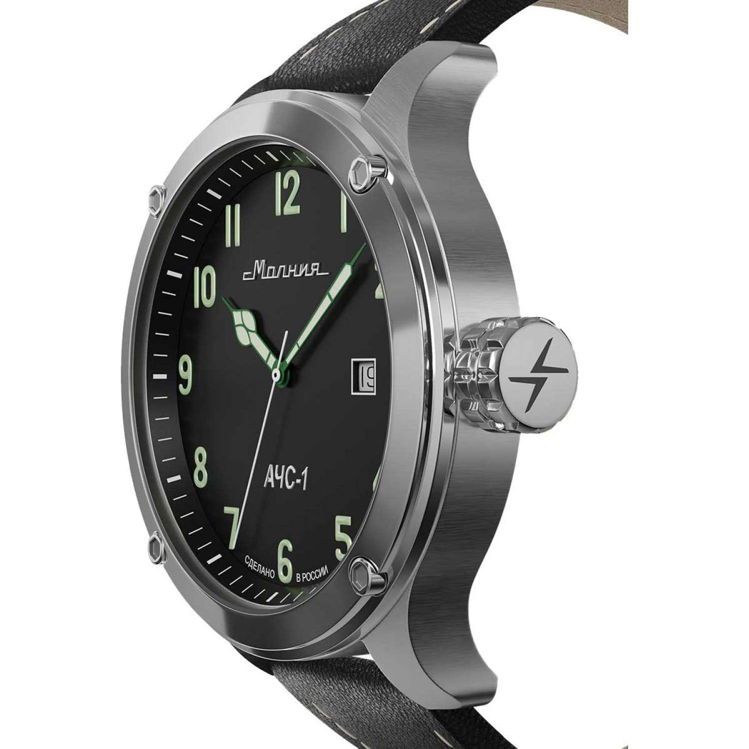 Мужские механические часы с автоподзаводом — это надёжный аксессуар от легендарного бренда «МОЛНИЯ», созданного на Челябинском часовом заводе. Корпус диаметром 44 мм выполнен из нержавеющей стали с зеркальной полировкой. БезельБезельВнешний ободок, закрепляющий стекло. В спортивных часах так называется поворотное кольцо с делениями на циферблате, выполняет роль таймера – замеряет отрезки времени на шкале. Неподвижный безель – элемент декора. Однонаправленно вращающийся безель на дайверских часах позволяет фиксировать моменты погружения и выныривания на поверхность. также имеет зеркальную отделку. Циферблат чёрного цвета оформлен стрелками и индексами со светонакопительным составом Super-LumiNova. Окошко даты расположено в положении 3 часов. Циферблат защищён сапфировым стекломСапфировое стеклоПрочный и надёжный материал из кристалла сапфира синтетического происхождения, характеризующийся особой твёрдостью и устойчивостью к царапинам и повреждениям.. Механизм — японский автоматический калибр Miyota 8215. Часы оснащены кожаным ремешком чёрного цвета с классической пряжкой. Водонепроницаемость 100 м позволяет использовать часы для плавания и повседневного ношения. Идеальный выбор для тех, кто ценит российское качество и мужественный дизайн.