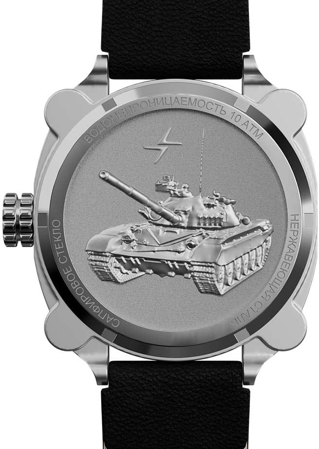 Мужские механические часы с автоподзаводом от бренда «МОЛНИЯ» — это стильный аксессуар, вдохновлённый дизайном приборной панели легендарного танка Т-72. Корпус диаметром 42 мм и толщиной 12 мм выполнен из нержавеющей стали 316L с матовой полировкой. БезельБезельВнешний ободок, закрепляющий стекло. В спортивных часах так называется поворотное кольцо с делениями на циферблате, выполняет роль таймера – замеряет отрезки времени на шкале. Неподвижный безель – элемент декора. Однонаправленно вращающийся безель на дайверских часах позволяет фиксировать моменты погружения и выныривания на поверхность. однонаправленный, вращающийся. Циферблат чёрного цвета оформлен арабскими цифрами и логотипом бренда. Окошко даты расположено в положении 3 часов и оснащено увеличительным стеклом. Стрелки и метки с люминесцентным покрытиемЛюминесцентное покрытиеПозволяет считывать показания времени в темноте. Производители наносят на стрелки, часовые индексы, безель или поверхность циферблата светонакопительный состав, дающий холодное свечение. Super-LumiNova. Циферблат защищён сапфировым стекломСапфировое стеклоПрочный и надёжный материал из кристалла сапфира синтетического происхождения, характеризующийся особой твёрдостью и устойчивостью к царапинам и повреждениям. с антибликовым покрытиемАнтибликовое покрытиеСлой оксида металла в 0,13-0,3 микрон, благодаря которому стекло часов не бликует и не отражает свет. Антибликовое покрытие уменьшает отражение света в 10 раз, обеспечивая отличную читаемость показателей циферблата.. Механизм — японский автоматический калибр Miyota 8215 запас хода до 42 часов. Заводная головка стилизована под гусеничную ленту, задняя крышка с гравировкой танка Т-72. Часы оснащены кожаным ремешком чёрного цвета с классической пряжкой и системой быстрой замены. Водонепроницаемость 100 м позволяет использовать часы для плавания и повседневного ношения. Идеальный выбор для тех, кто ценит инженерное наследие и мощный дизайн.