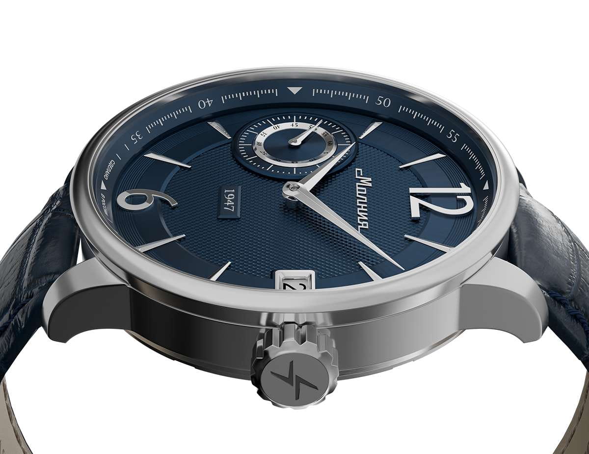 Мужские механические часы с ручным подзаводом — это аксессуар от легендарного бренда «МОЛНИЯ», созданный на Челябинском часовом заводе. Корпус диаметром 41 мм выполнен из нержавеющей стали 316L с зеркальной полировкой. Циферблат синего цвета оформлен арабскими цифрами и стальными индексами. Малая секундная стрелка вынесена на позицию 9 часов, окошко даты расположено в положении 3 часов. Циферблат защищён сапфировым стекломСапфировое стеклоПрочный и надёжный материал из кристалла сапфира синтетического происхождения, характеризующийся особой твёрдостью и устойчивостью к царапинам и повреждениям.. Механизм — мануфактурный калибр 3605, собранный вручную, с запасом хода до 40 часов. Прозрачная задняя крышка позволяет наблюдать за работой механизма. Часы оснащены кожаным ремешком синего цвета с раскладной застёжкойРаскладная застёжкаТакой тип застёжки используется только на браслетах из металла. Она никогда не раскрывается полностью, происходит разделение на 2 и более частей. Раскладывающая застёжка снизит вероятность потери часов к минимуму. и системой быстрой замены. Водонепроницаемость 100 м позволяет использовать часы для плавания и повседневного ношения. Идеальный выбор для тех, кто ценит российское качество и традиции.