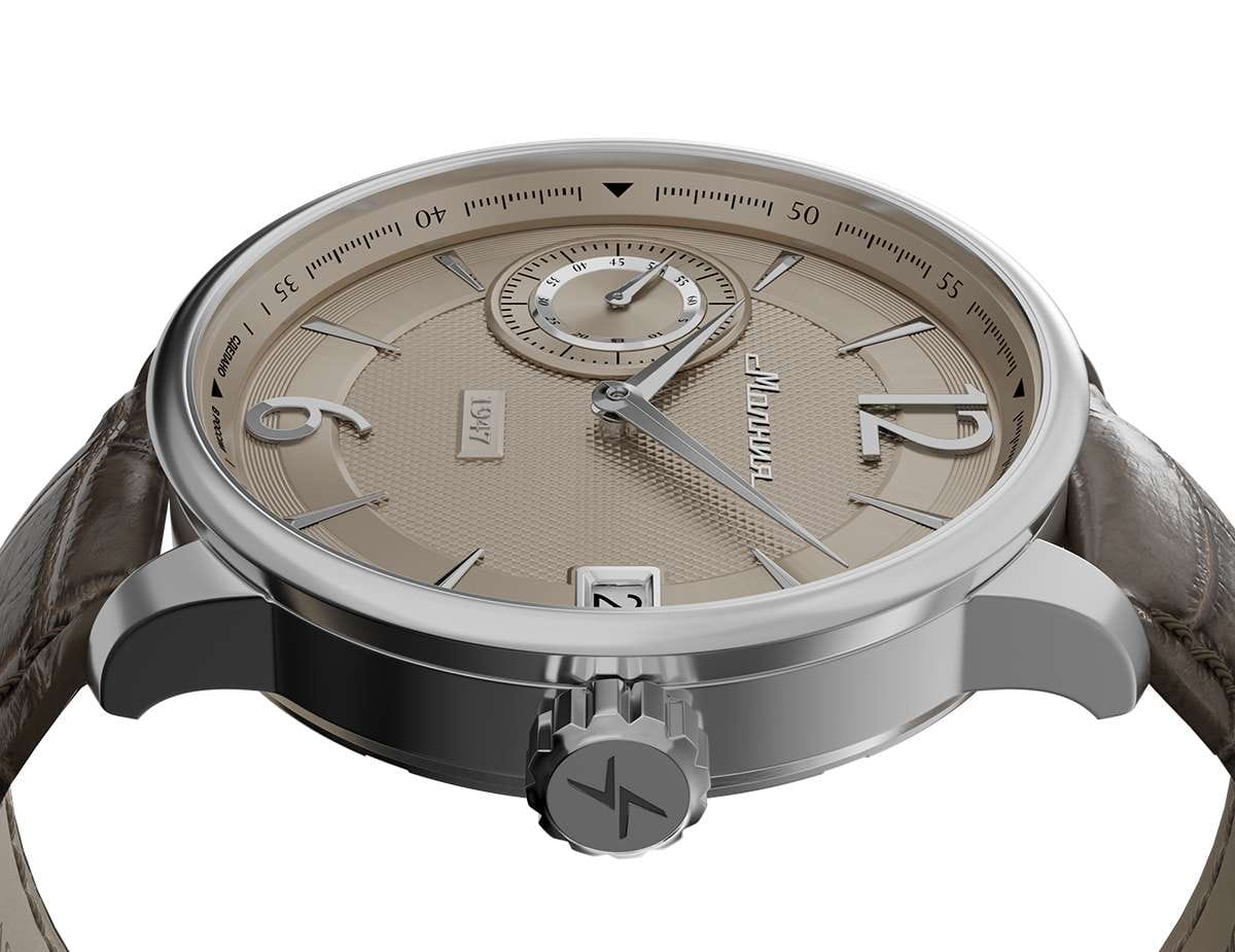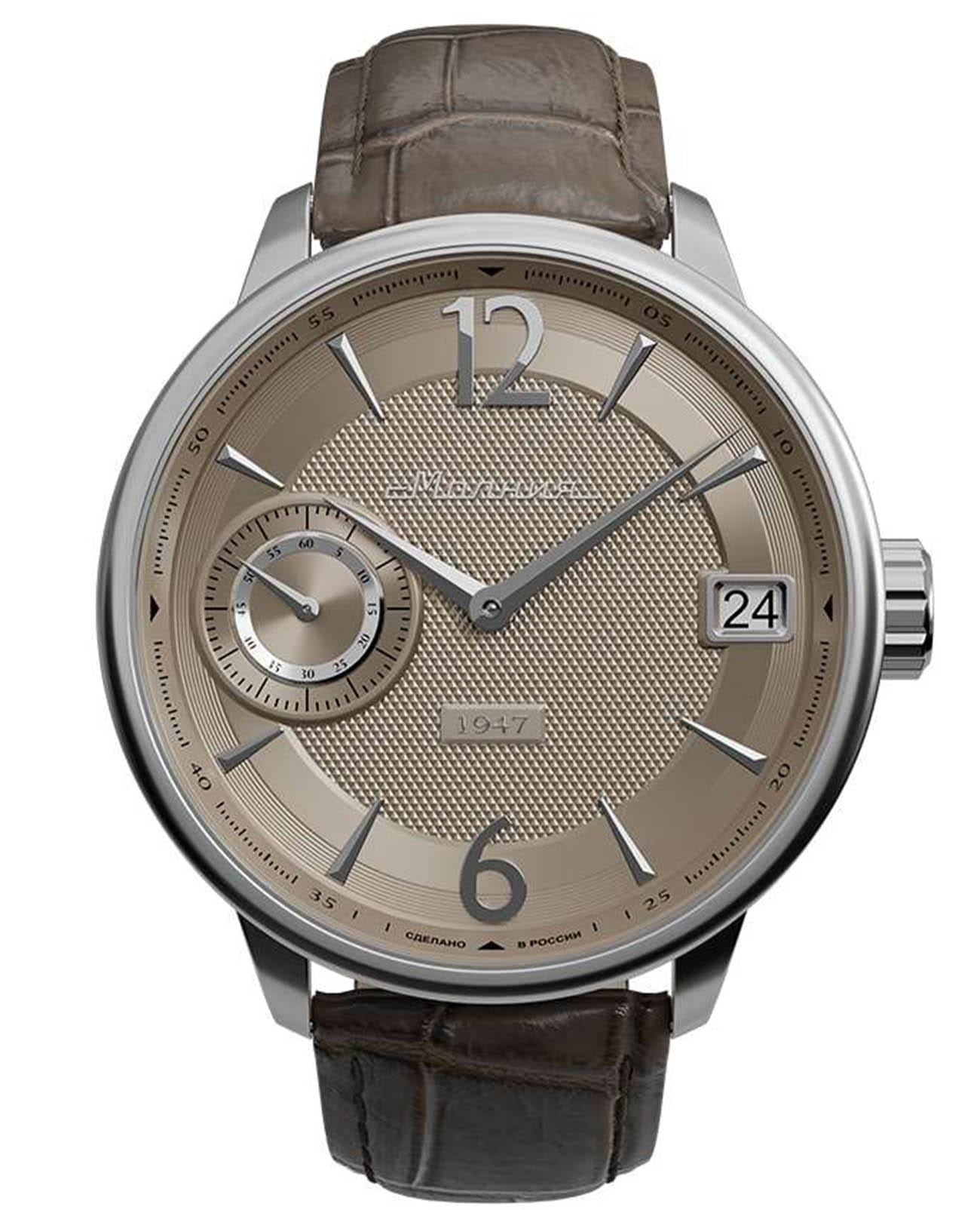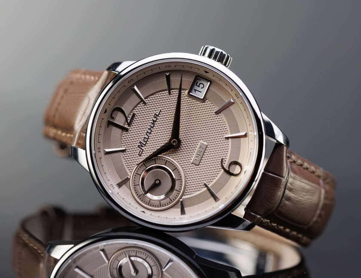 Мужские механические часы с ручным подзаводом — это аксессуар от легендарного бренда «МОЛНИЯ», созданный на Челябинском часовом заводе. Корпус диаметром 41 мм выполнен из нержавеющей стали 316L с зеркальной полировкой. Циферблат бежевого цвета оформлен арабскими цифрами и стальными индексами. Малая секундная стрелка вынесена на позицию 9 часов, окошко даты расположено в положении 3 часов. Циферблат защищён сапфировым стекломСапфировое стеклоПрочный и надёжный материал из кристалла сапфира синтетического происхождения, характеризующийся особой твёрдостью и устойчивостью к царапинам и повреждениям.. Механизм — мануфактурный калибр 3605, собранный вручную, с запасом хода до 40 часов. Прозрачная задняя крышка позволяет наблюдать за работой механизма. Часы оснащены кожаным ремешком коричневого цвета с раскладной застёжкойРаскладная застёжкаТакой тип застёжки используется только на браслетах из металла. Она никогда не раскрывается полностью, происходит разделение на 2 и более частей. Раскладывающая застёжка снизит вероятность потери часов к минимуму. и системой быстрой замены. Водонепроницаемость 100 м позволяет использовать часы для плавания и повседневного ношения. Идеальный выбор для тех, кто ценит российское качество и традиции.
